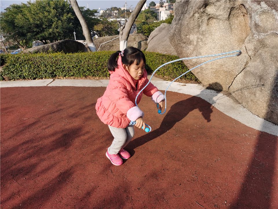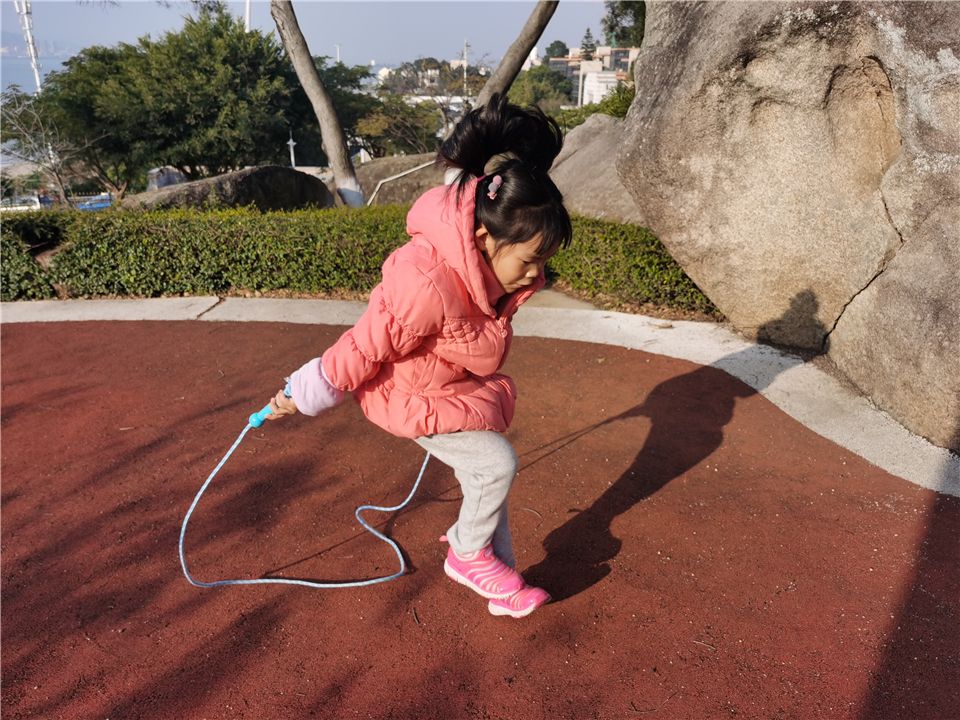 还没有找到平衡感的玥玥宝贝怎么也跳不过去,她开始琢磨着把跳绳分步骤来跳,先甩绳子,再抬高腿一步一步从绳子上走过去,背拱的跟小虾一样,虽然很累,但还是执着地“跳”着。老师忍不住要去帮她一把,先教她学会双脚前掌起跳再原地落下这一基本动作。