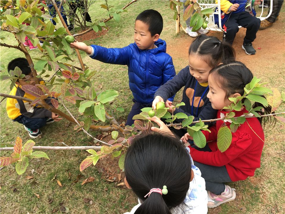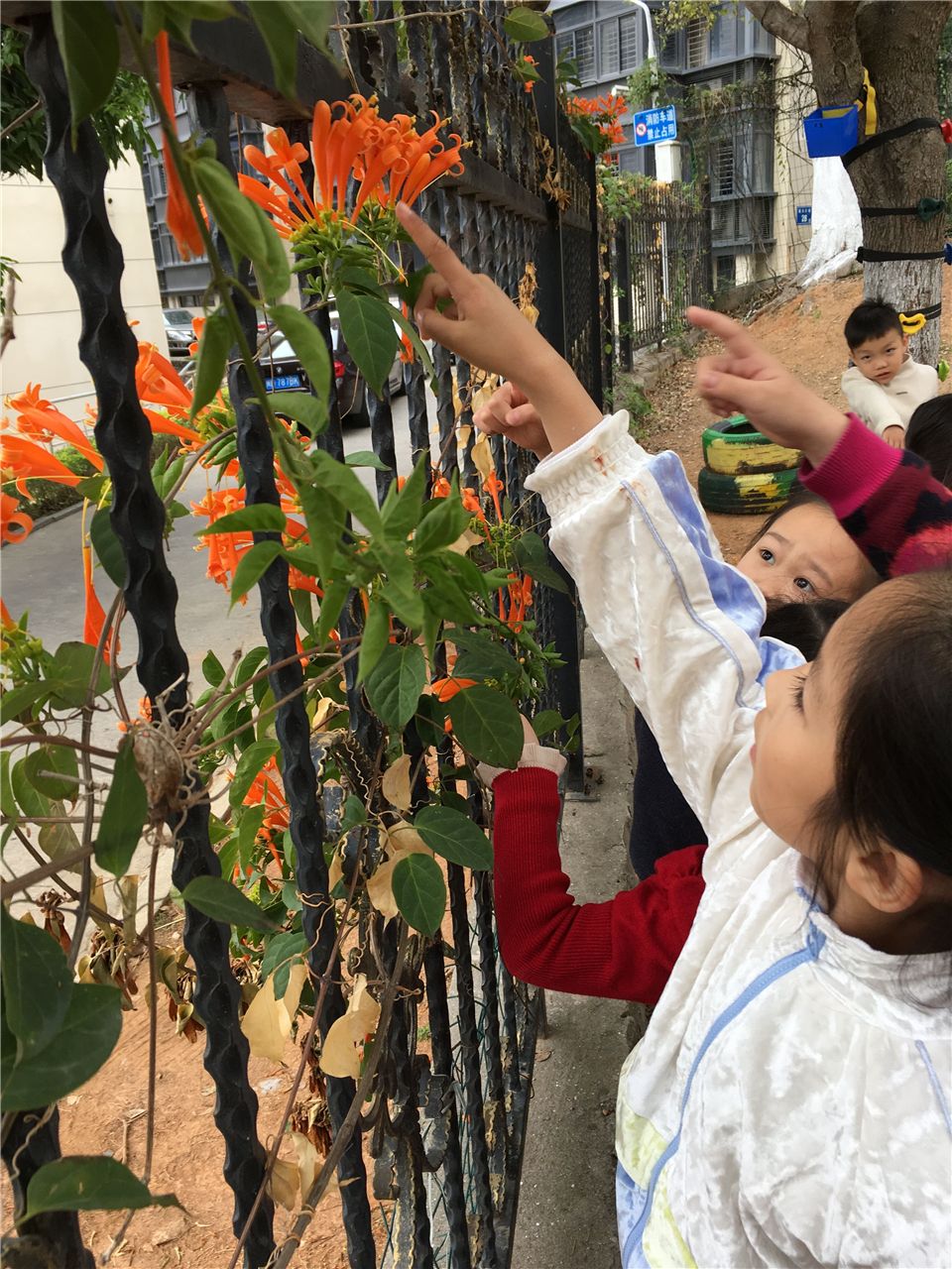 点心过后,孩子们在老师的带领下来到了绿荫浓浓的小山坡,经过了一个假期的洗礼,小山坡发生了什么样的变化呢?一到山坡,孩子们就尽情的与自己的伙伴来一次奇幻的探索之旅“哇!你们看,这长出了好美的花啊!”“这是茶花吧!我来闻闻香不香。”这些花朵的颜色好鲜艳,好像穿了一件好看的裙子。”馨馨一边指着炮仗花一边和旁边的小朋友说。“这里还有快长大的芭乐耶。”“老师,还有小杨桃呢。”“老师,这些水果树也和我们一样,过新年也长大了。”小朋友,我们一起照顾这些水果树吧,等它们都长大了,我们就有好吃的水果大餐了。