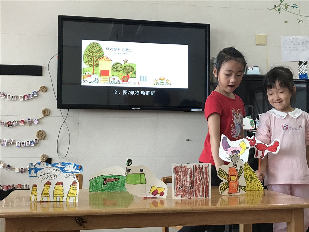 《母鸡萝丝去散步》全书只有44个字,其中包含6个无字页。如此简单的绘本故事却深受大五班小朋友们的喜爱。来,咱们打开书一起跟着母鸡萝丝的脚步逛一逛吧!看看大五班的小朋友们是如何玩转绘本的呢?