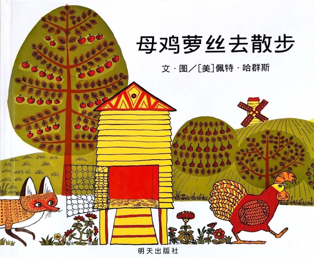 封面上的这只母鸡就是萝丝,她昂首挺胸,悠然自得的往前走着。在母鸡的身后,有一只狐狸,鬼鬼祟祟的跟在萝丝身后。放眼望去,农场里一派丰收的景象,看,苹果树,梨树都是硕果累累,鸡舍旁边的花儿也开的正艳。