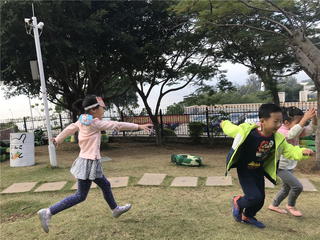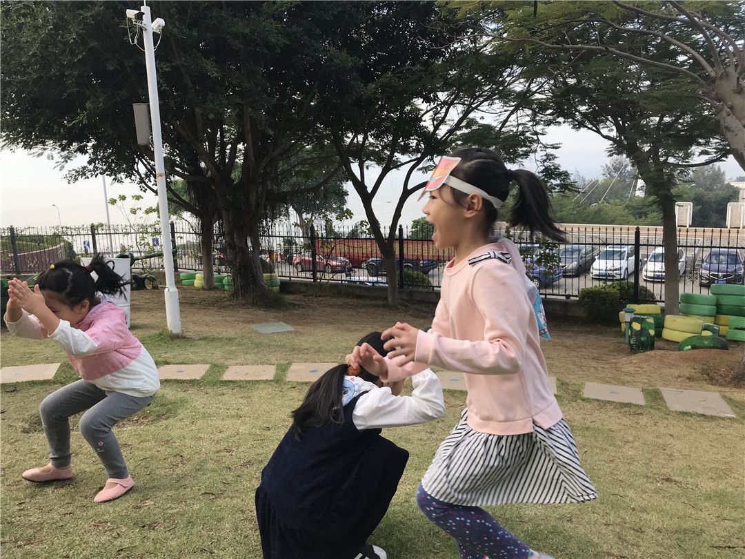 故事表演完,小朋友们还意犹未尽,把《母鸡萝丝去散步》的故事延伸至户外游戏。瞧,大家玩起了《狐狸和鸡》的游戏,“小鸡小鸡叽叽叽,来到草地找虫吃。狐狸来啦,大家快躲进鸡窝里去!”