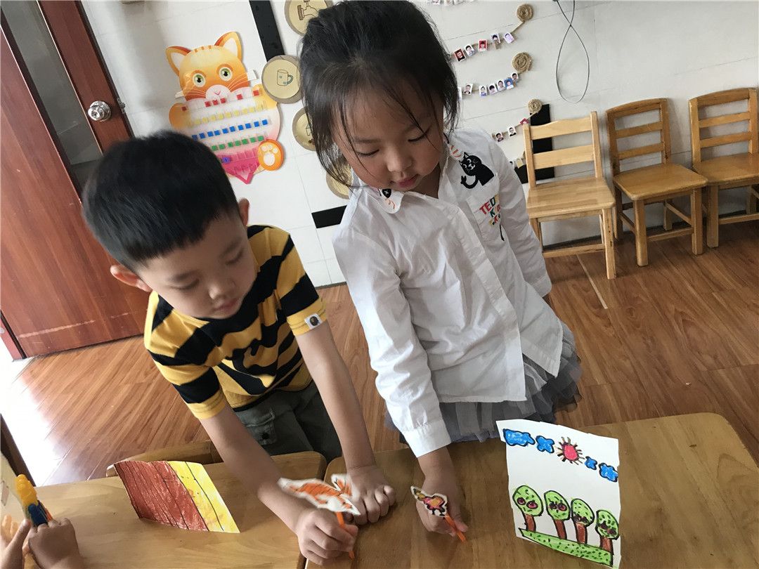 小朋友们一起自制故事角色和场景,表演游戏开始啦!大家一起商量、讨论,分配角色,轮流当小演员和小观众。小朋友不仅自编台词,还有的加入拟声词,增加了故事的趣味性。玩得不亦乐乎!