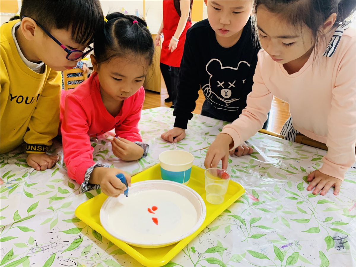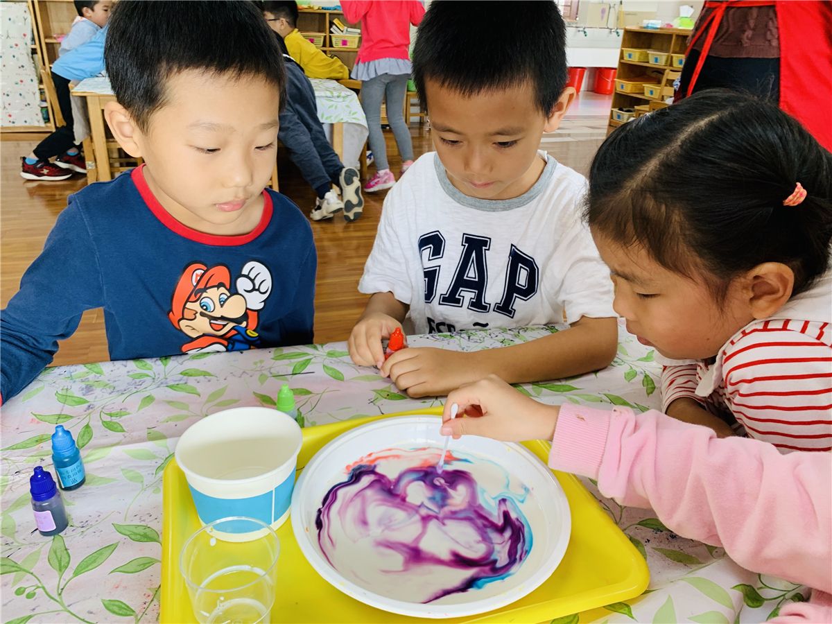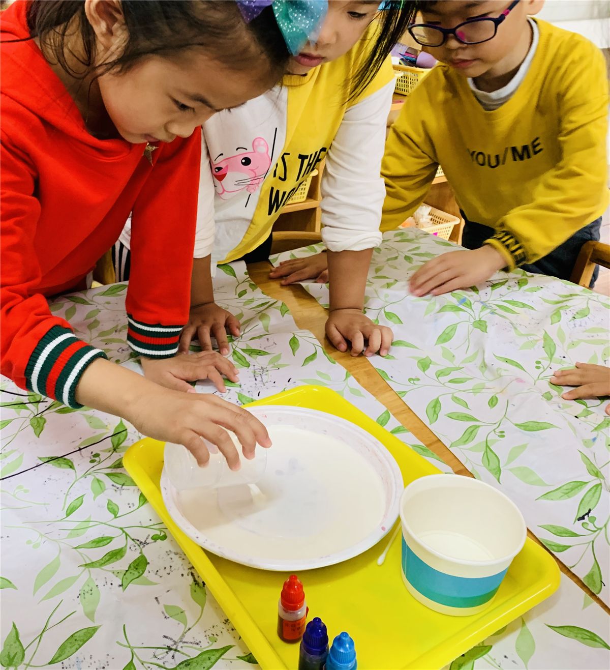 孩子们拿着棉签,蘸一蘸,在牛奶里随意搅动,发掘出色彩组合的无限可能。