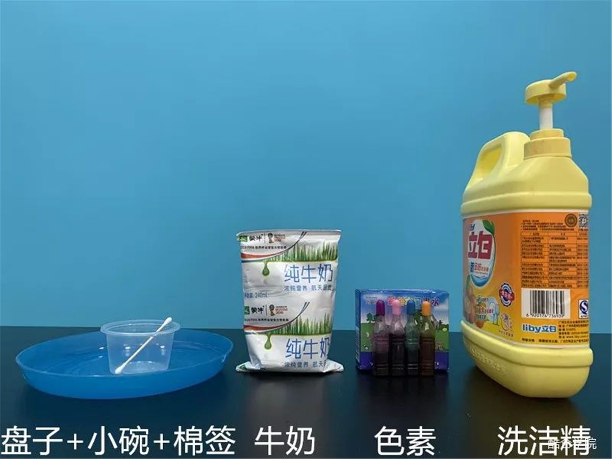实验开始咯,我们要准备好一瓶牛奶、一根棉签、一点洗洁精、若干瓶色素和一个大盘子。