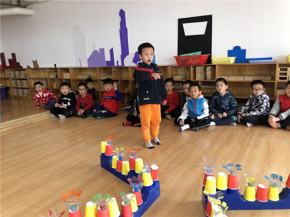 “我们用彩色的纸杯有规律地摆成圆形舞台的样子,然后再放上漂亮的小花。”“对了,长木条已经不够了。我们去拿短一点的木条错开垒高楼梯才会稳。”