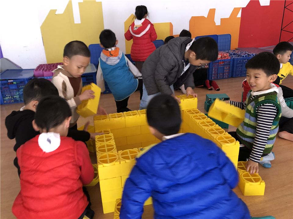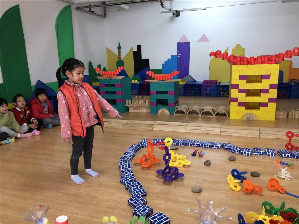 “小梦、小璇、小菲,你们负责去搭主楼的楼梯,最好是去拿长长的木条垒起来,然后一层一层往下放。剩下我们这几个就负责把湖围起来,然后用雪花片和夹子拼水里的动物。”“我们这组就可以先用长条的塑料积塑把小舞台围起来,你们几个就负责把旁边的花草进行装饰一下。剩下的人就负责把小舞台后面的楼梯搭建一下。”