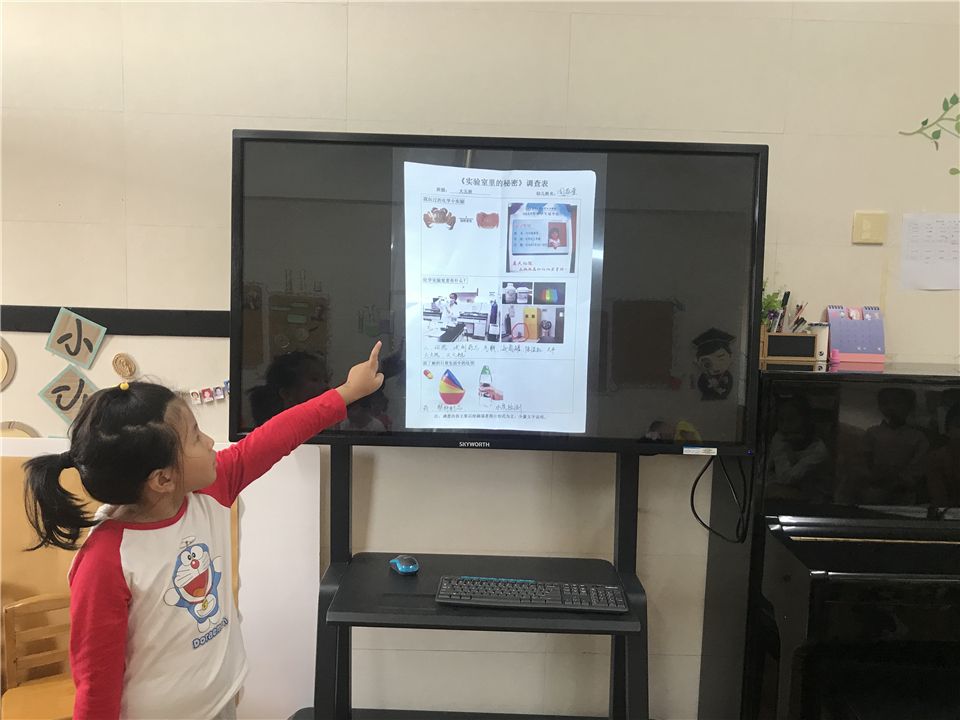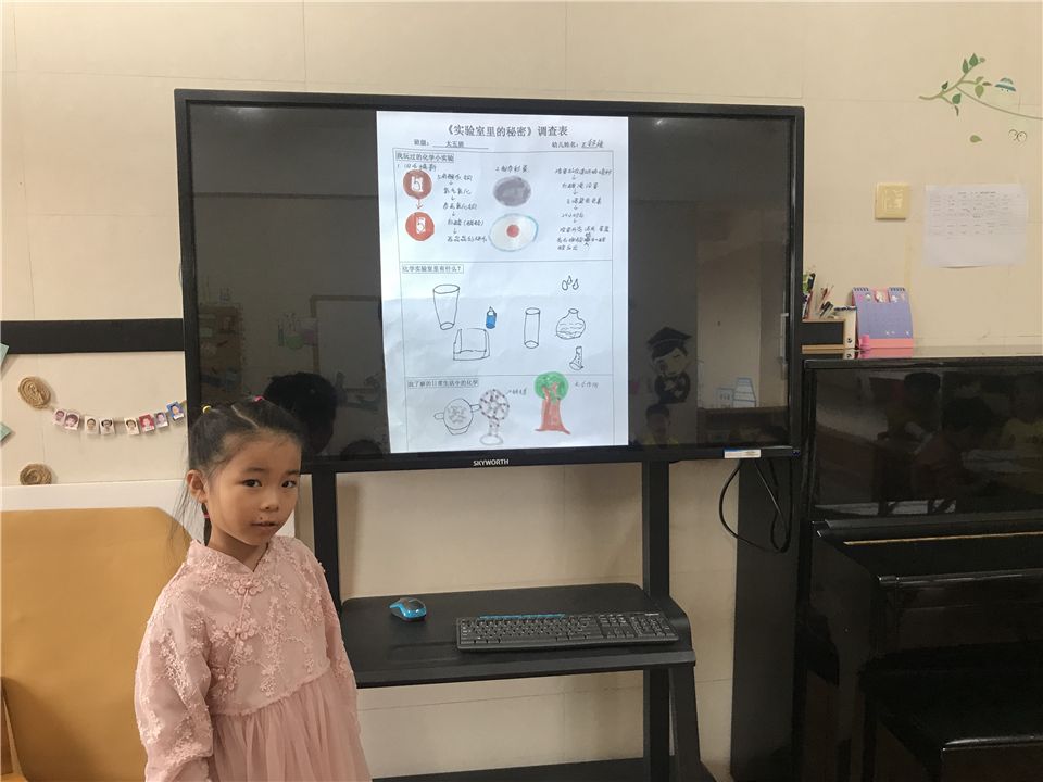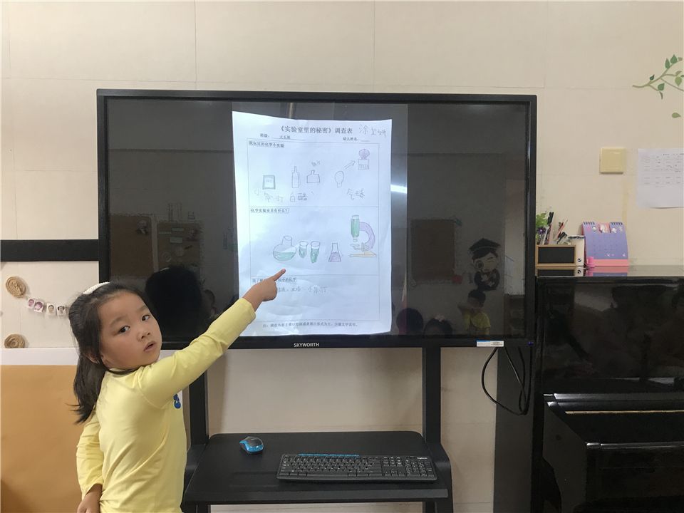 在爸爸妈妈的帮助下,萌娃们查阅资料,制作调查表《实验室里的秘密》,并带来班级与小朋友一起交流分享,大家热烈地讨论着自己的调查结果。