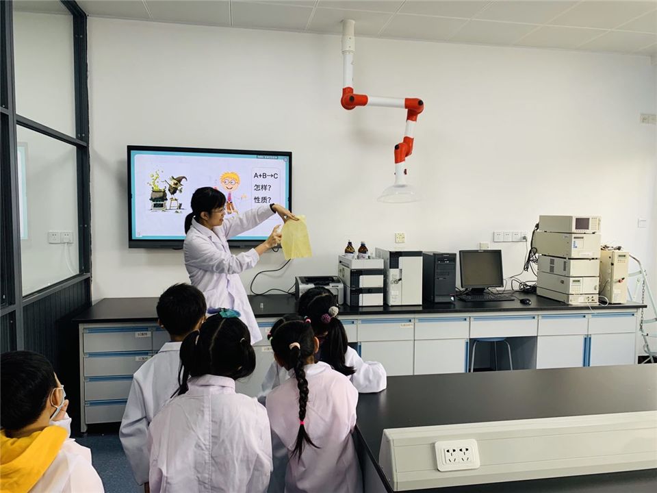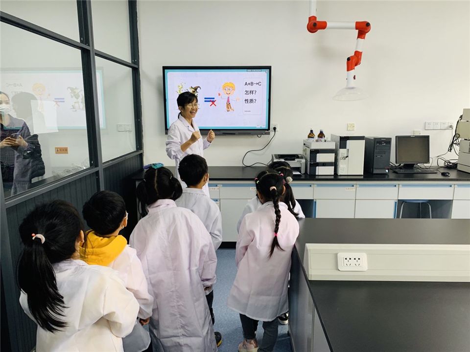 终于来到了萌娃们盼望已久的化学化工学院,大家东瞧瞧西看看,睁着好奇的大眼睛四处张望着。来到了实验室,若萱妈妈与萌娃们热情地打招呼后,用最简单的方法为大家做了关于化学的解释:“化学是关于变化的科学。化学实验室里经常做的实验室是把一样东西和其他东西混合在一起产生的一种新的东西。”