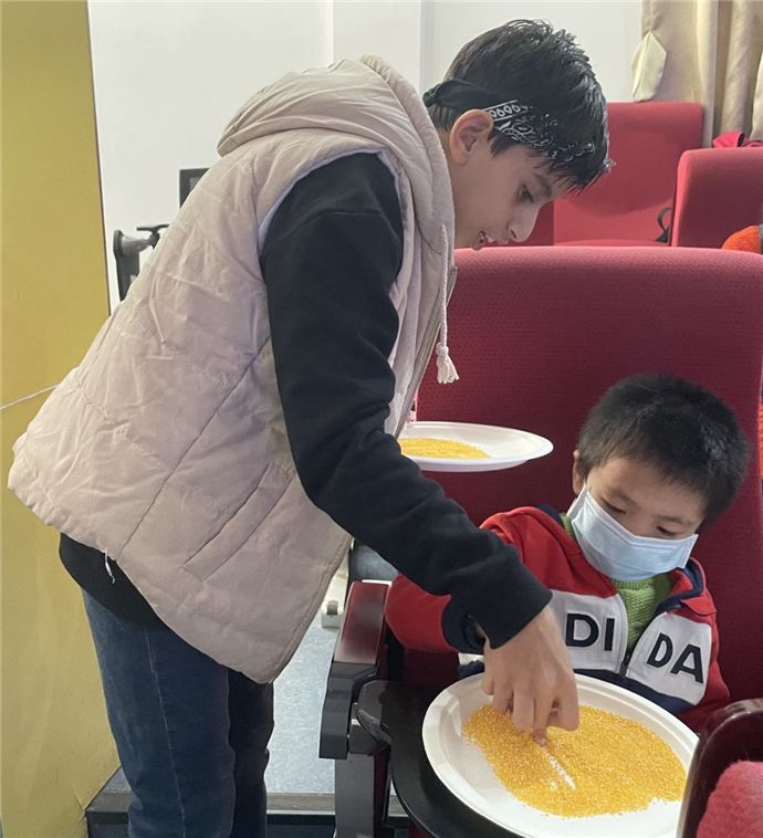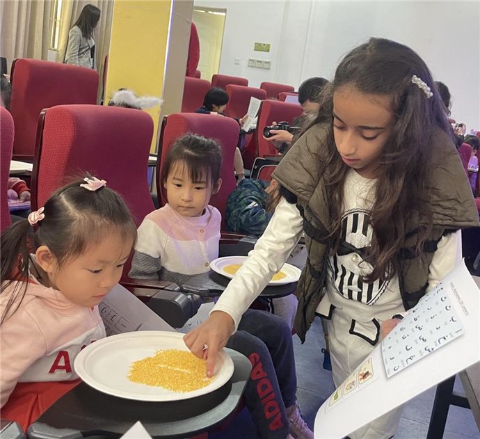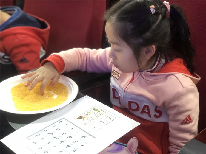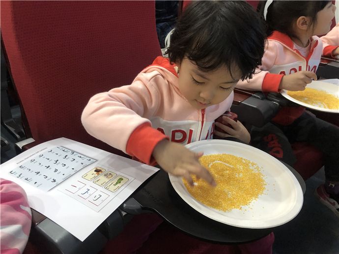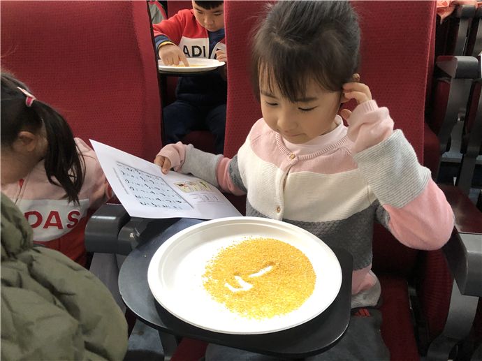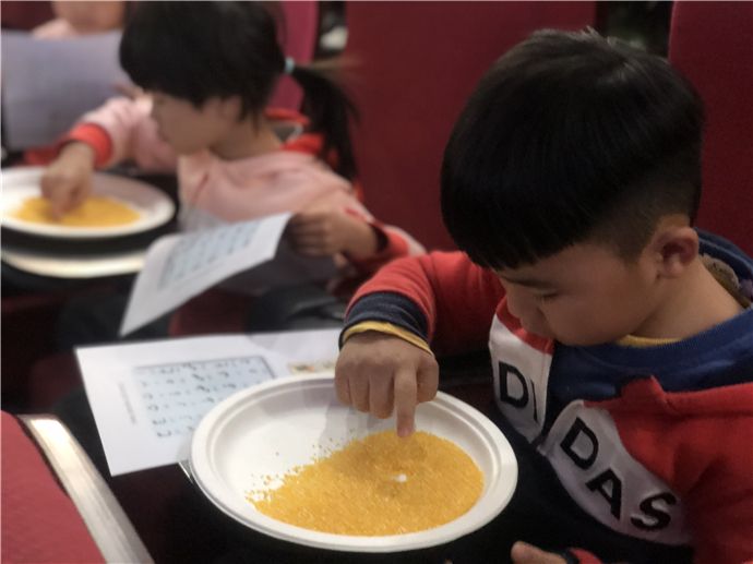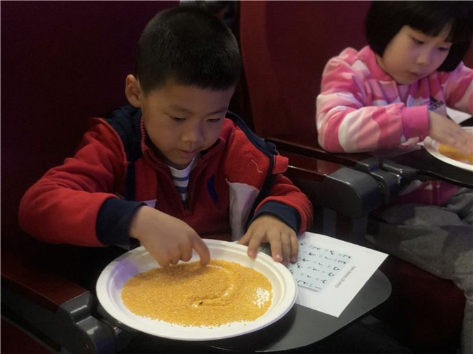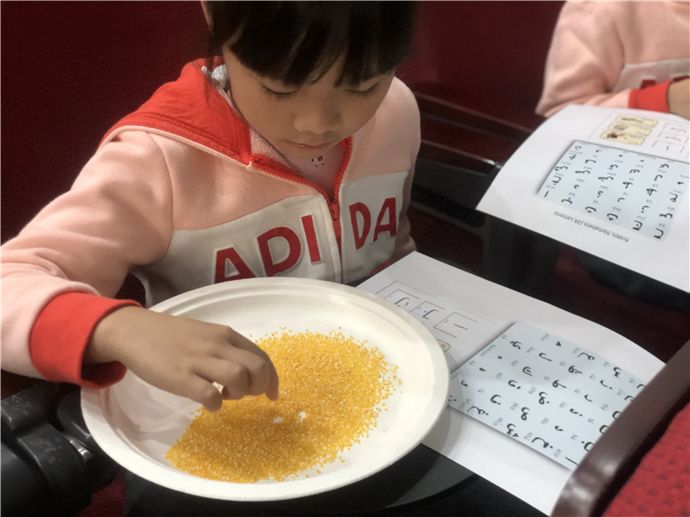 Mimi妈妈还用心准备了纸盘和小米,分发给每个小朋友,让他们现场实践如何书写埃及字母。一开始有的小朋友看了半天却不敢动手尝试,后来经过mimi和mimi的哥哥姐姐的帮助下,每个小朋友都能够大胆的进行尝试。