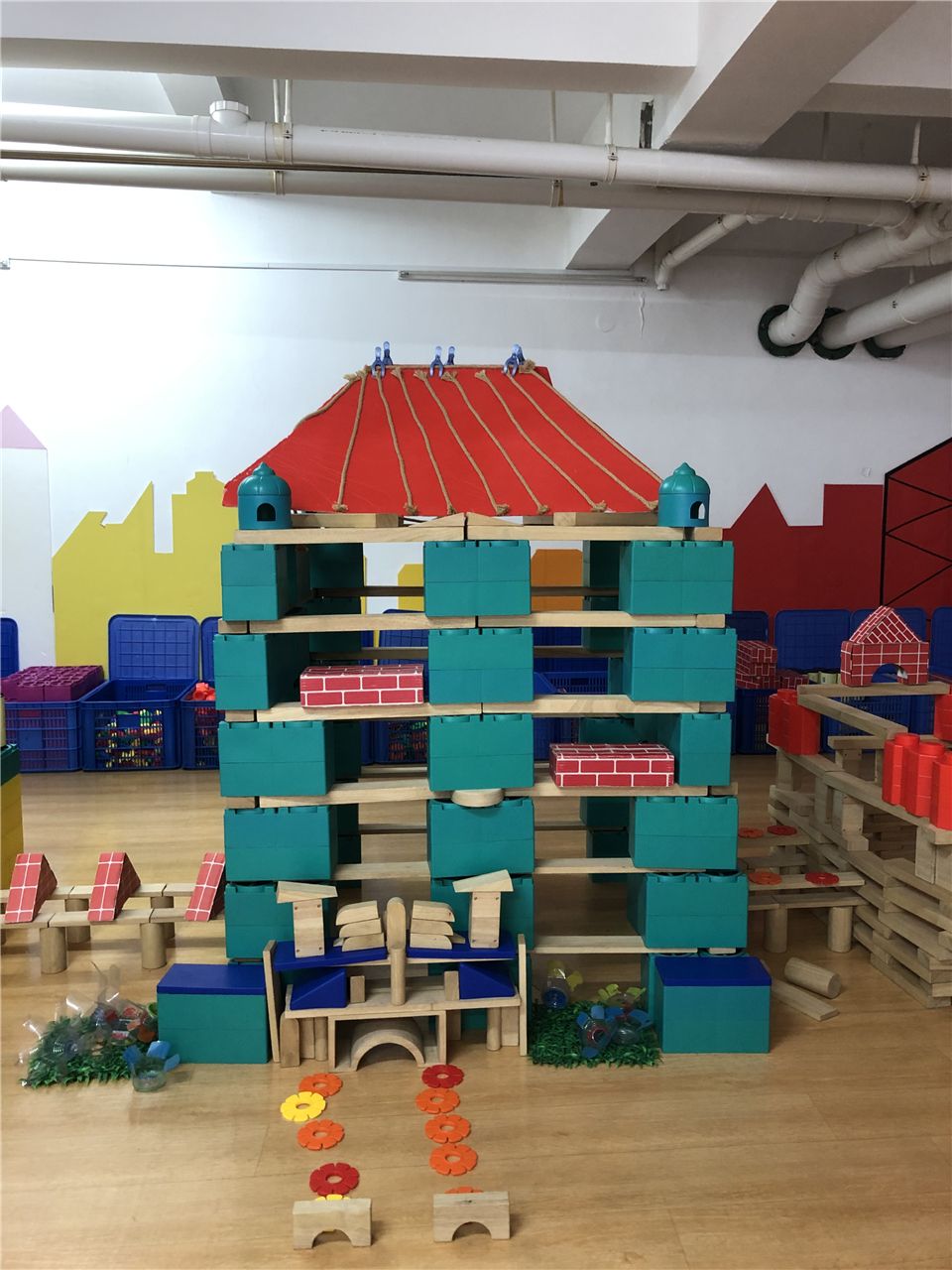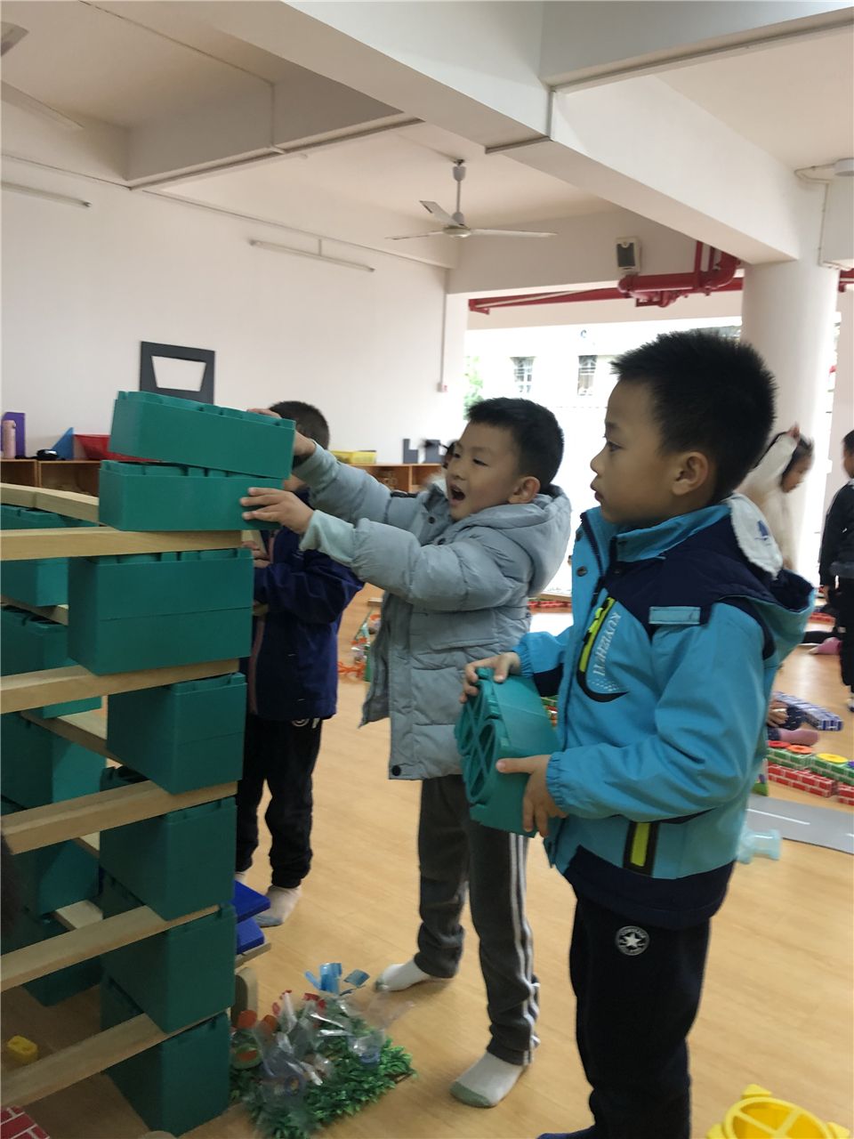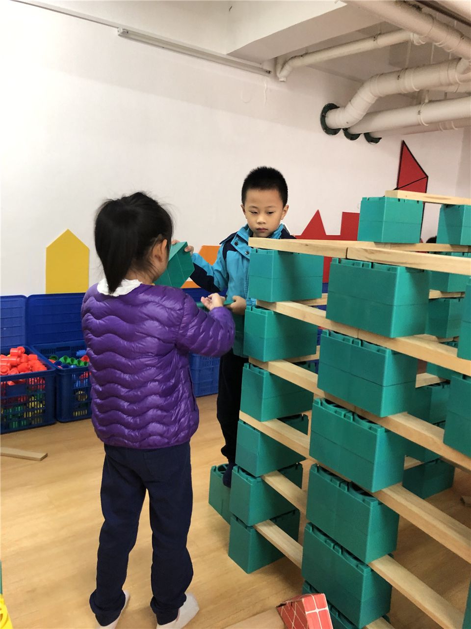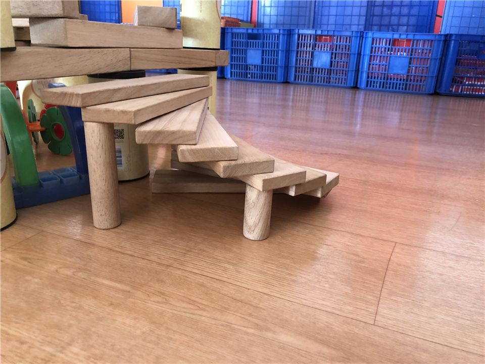 “主楼要比副楼高,我们换积塑和木板来搭会比较牢固哦!”