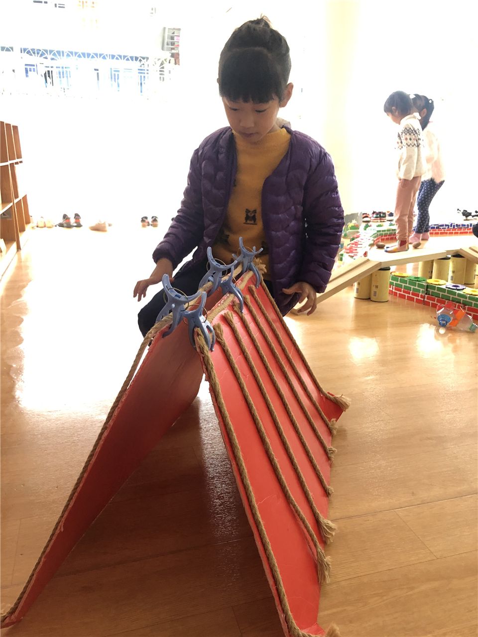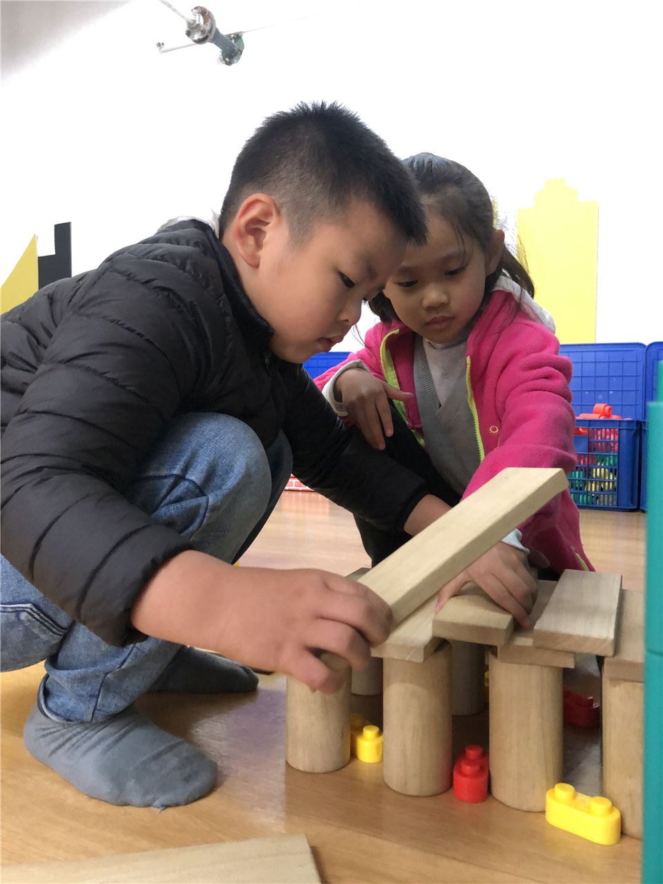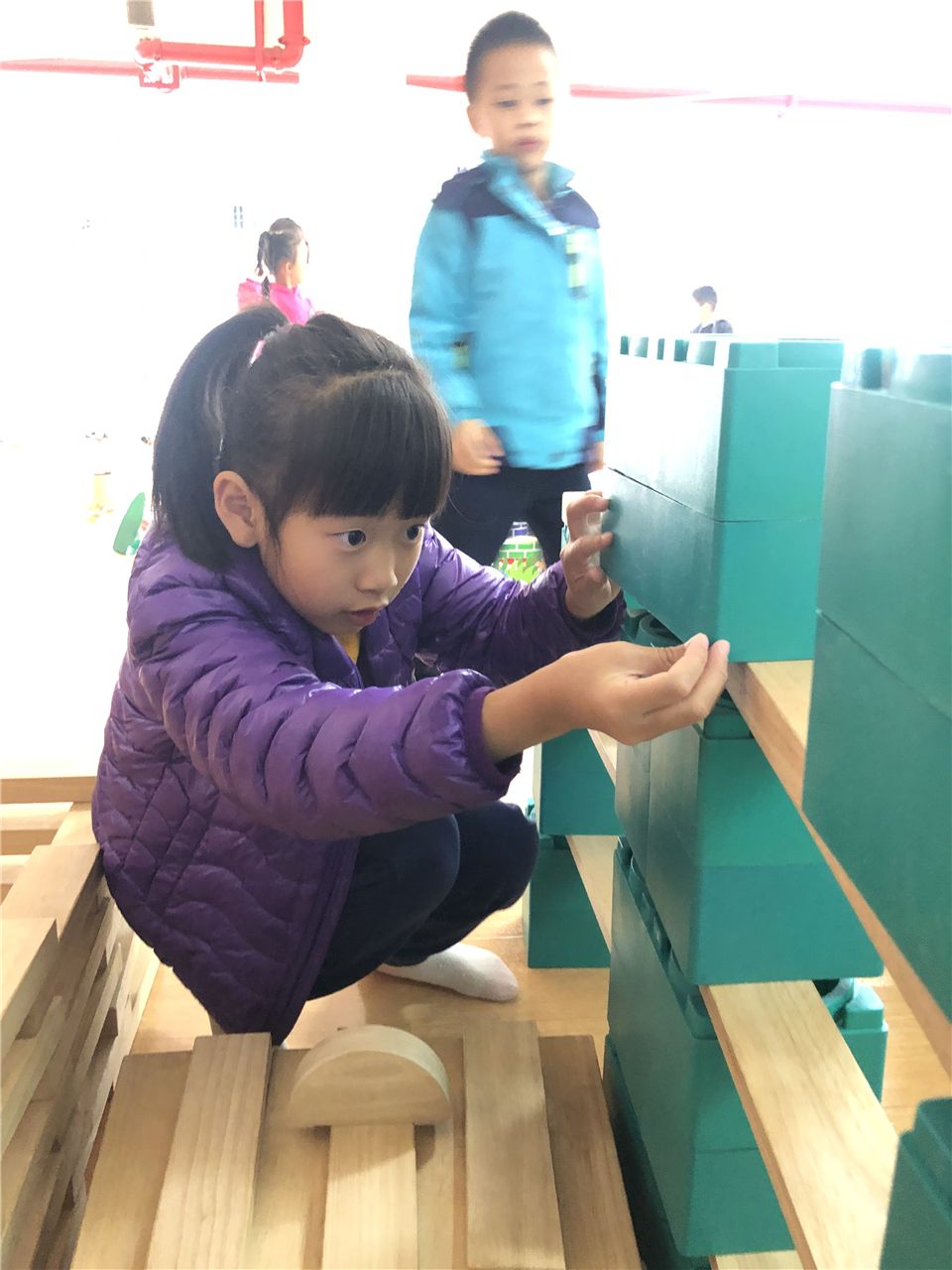 “主楼要比副楼高,我们换积塑和木板来搭会比较牢固哦!”
