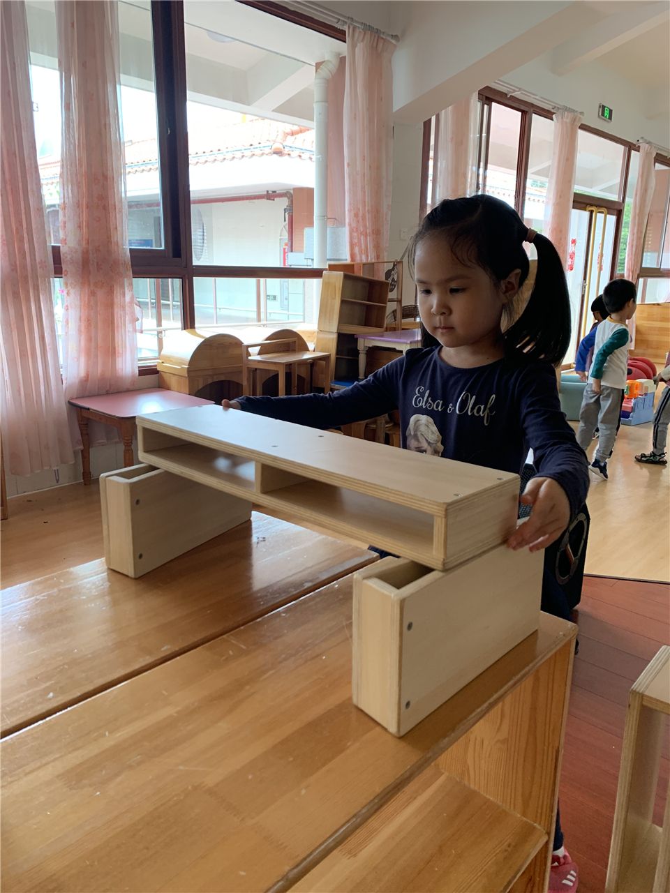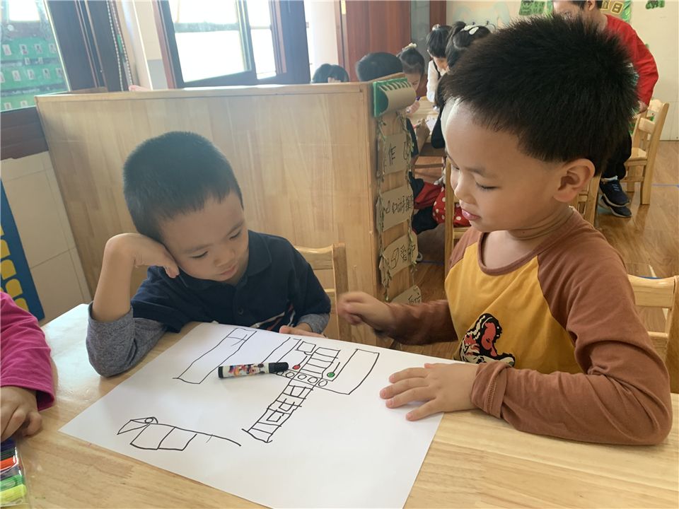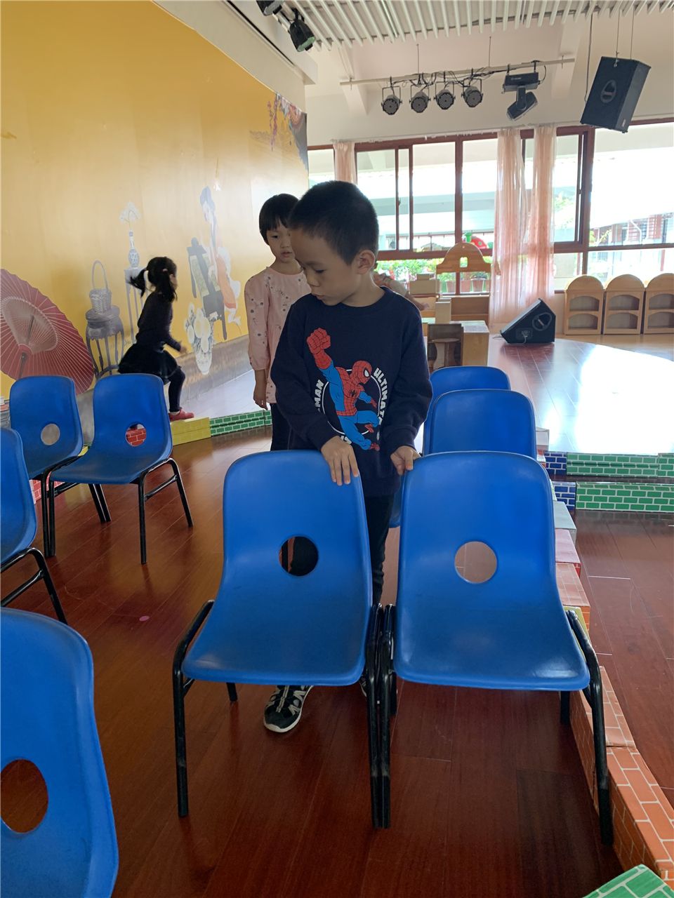 孩子们由此展开了如何搭飞机的讨论。“我们可以用什么搭飞机呢?”孩子们陷入了思考……。很快地,小怡就举起了他的小手,很兴奋地告诉我:“老师,我觉得可以用小椅子。”