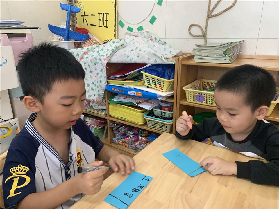 飞机场还需要什么?机票、安检门、空姐帽子、好吃的……大家七嘴八舌地讨论起来。商量好之后孩子们就开始分组设计,有的设计安检门,有的设计飞机票,有的设计飞机餐,大家忙得不亦乐乎!