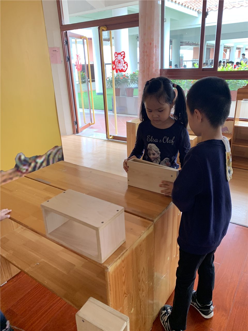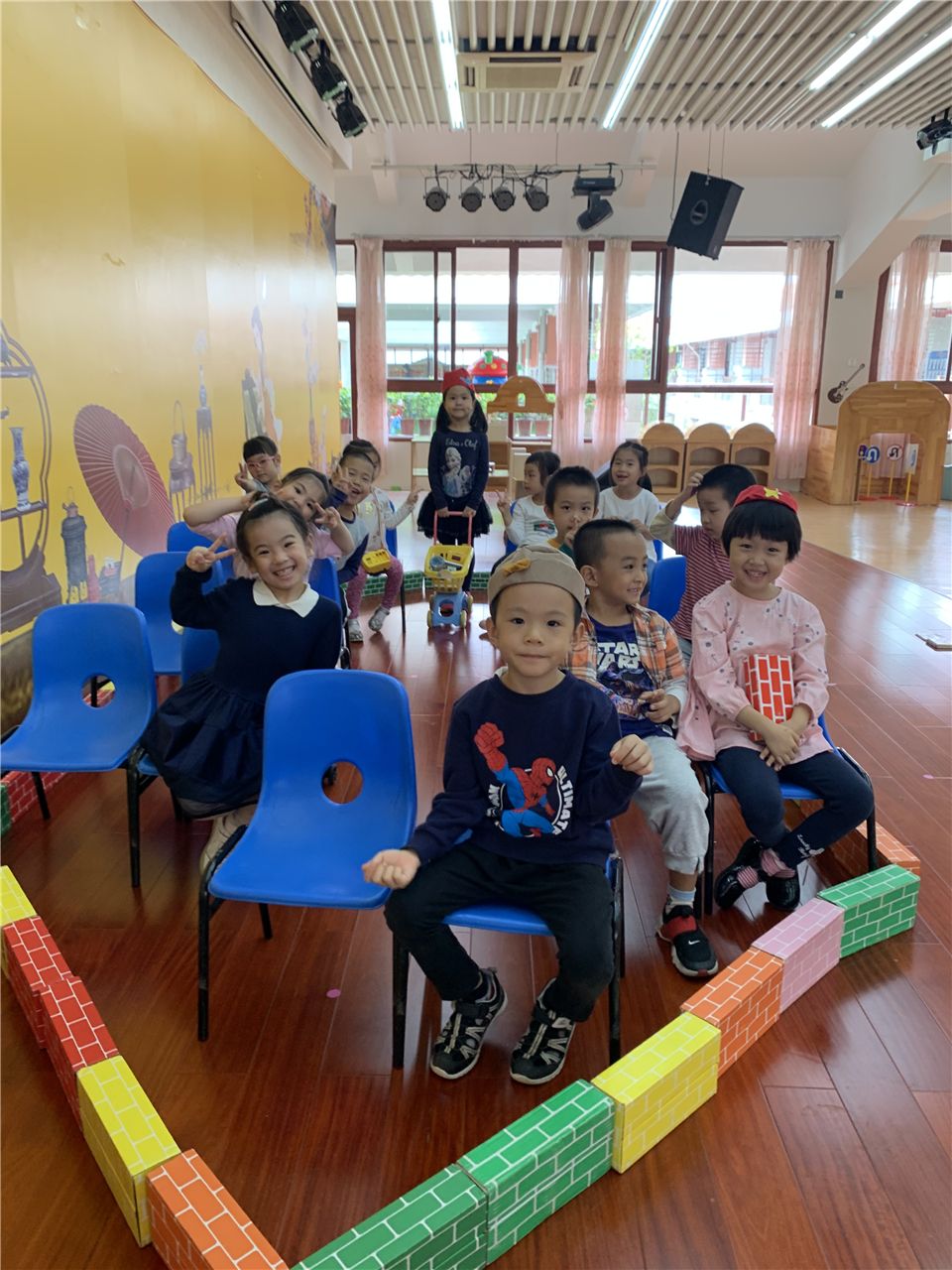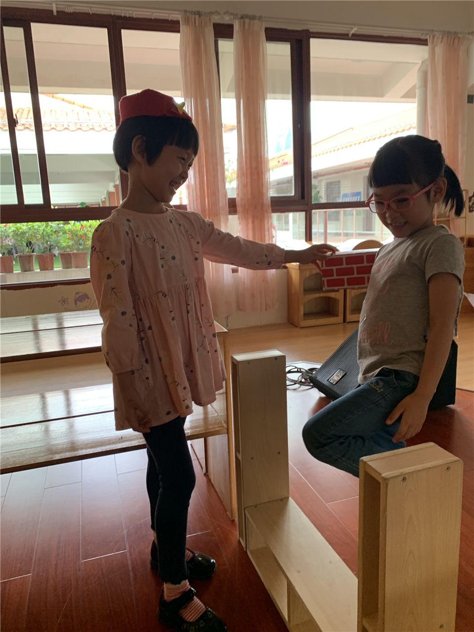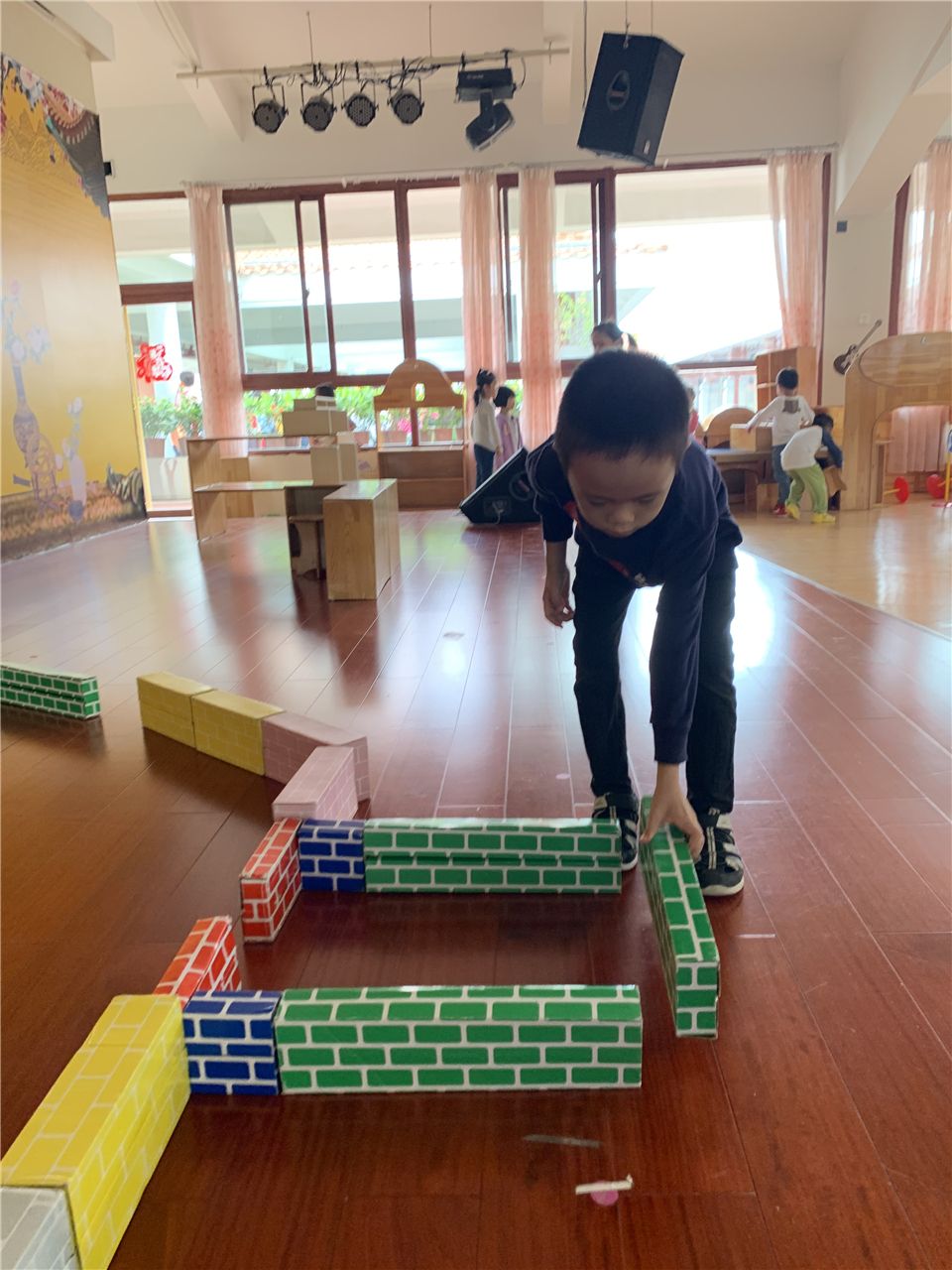 游戏开始丰富起来,孩子们想来想去,最后选择用大型积木搭安检门。