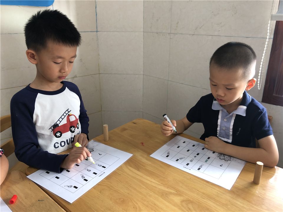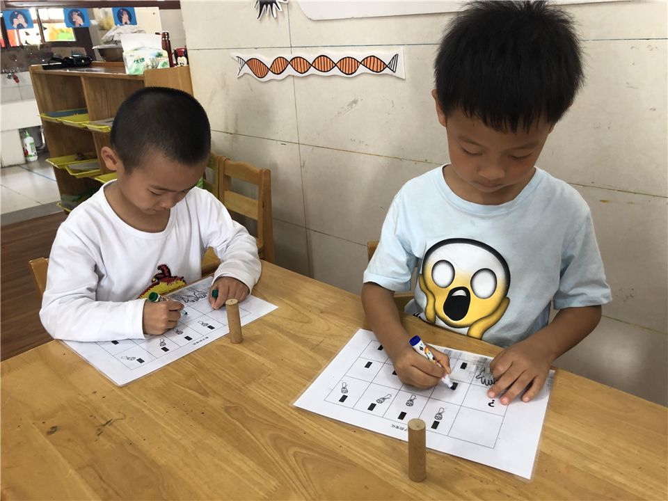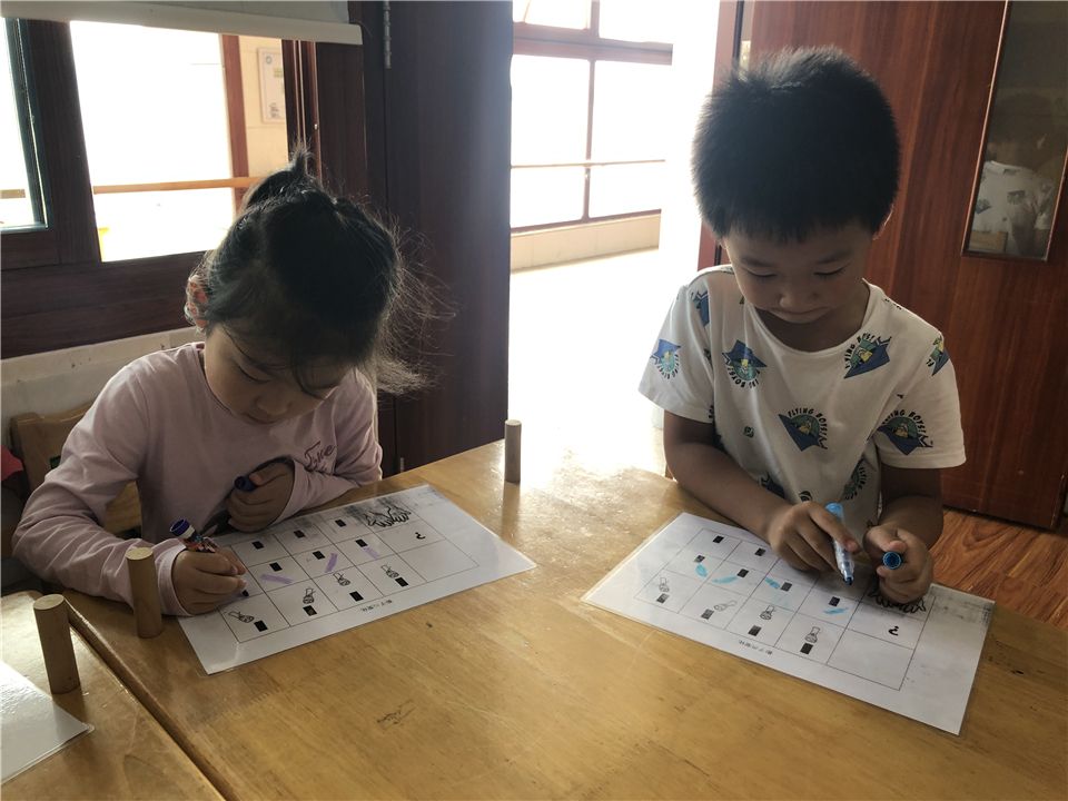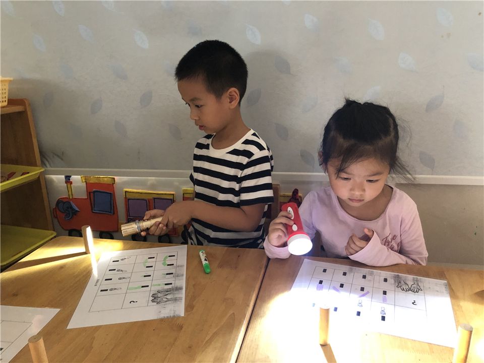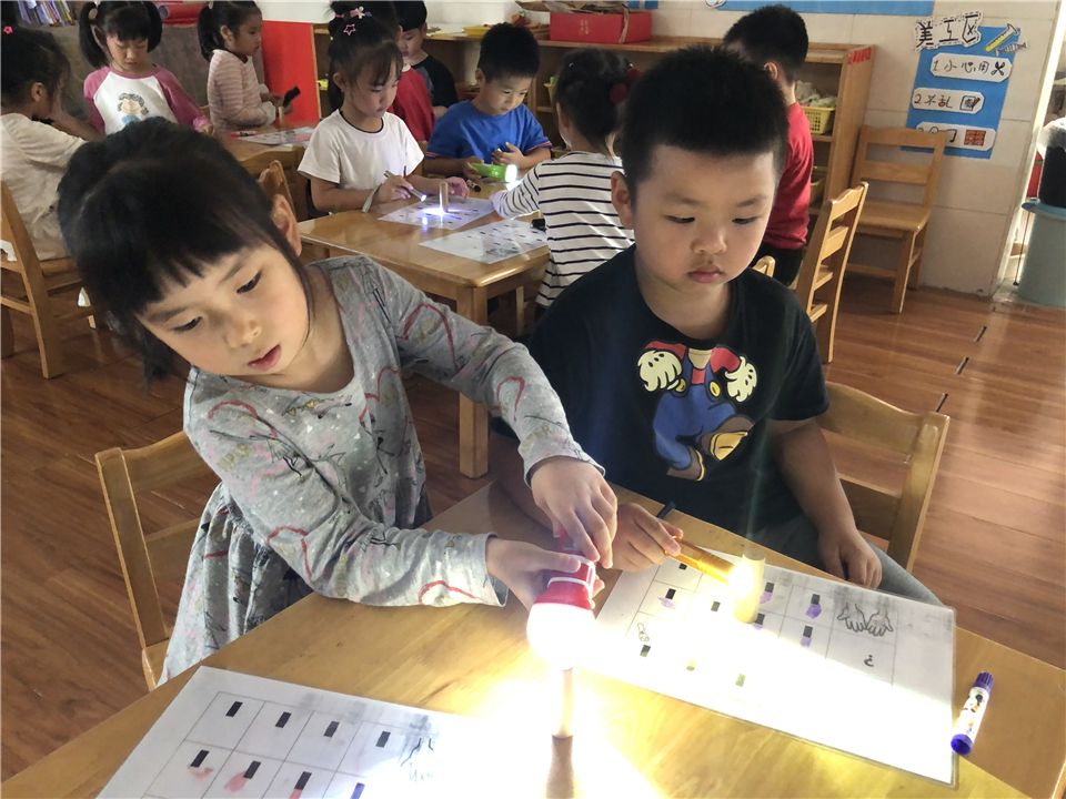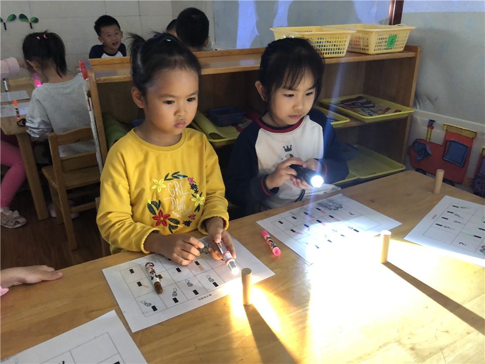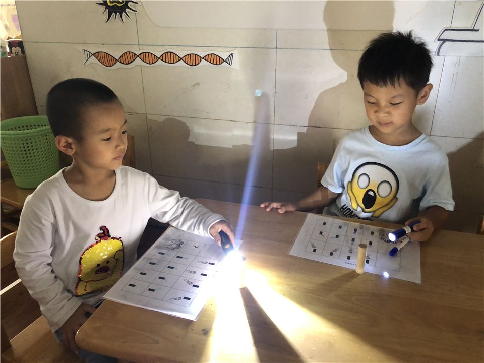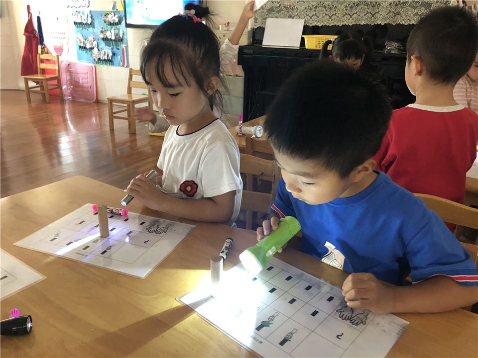 瞧!孩子们拿着手电筒或远或近地照着桌上的木柱。从猜测到实验最后记录,孩子们仔细观察着影子产生的变化。