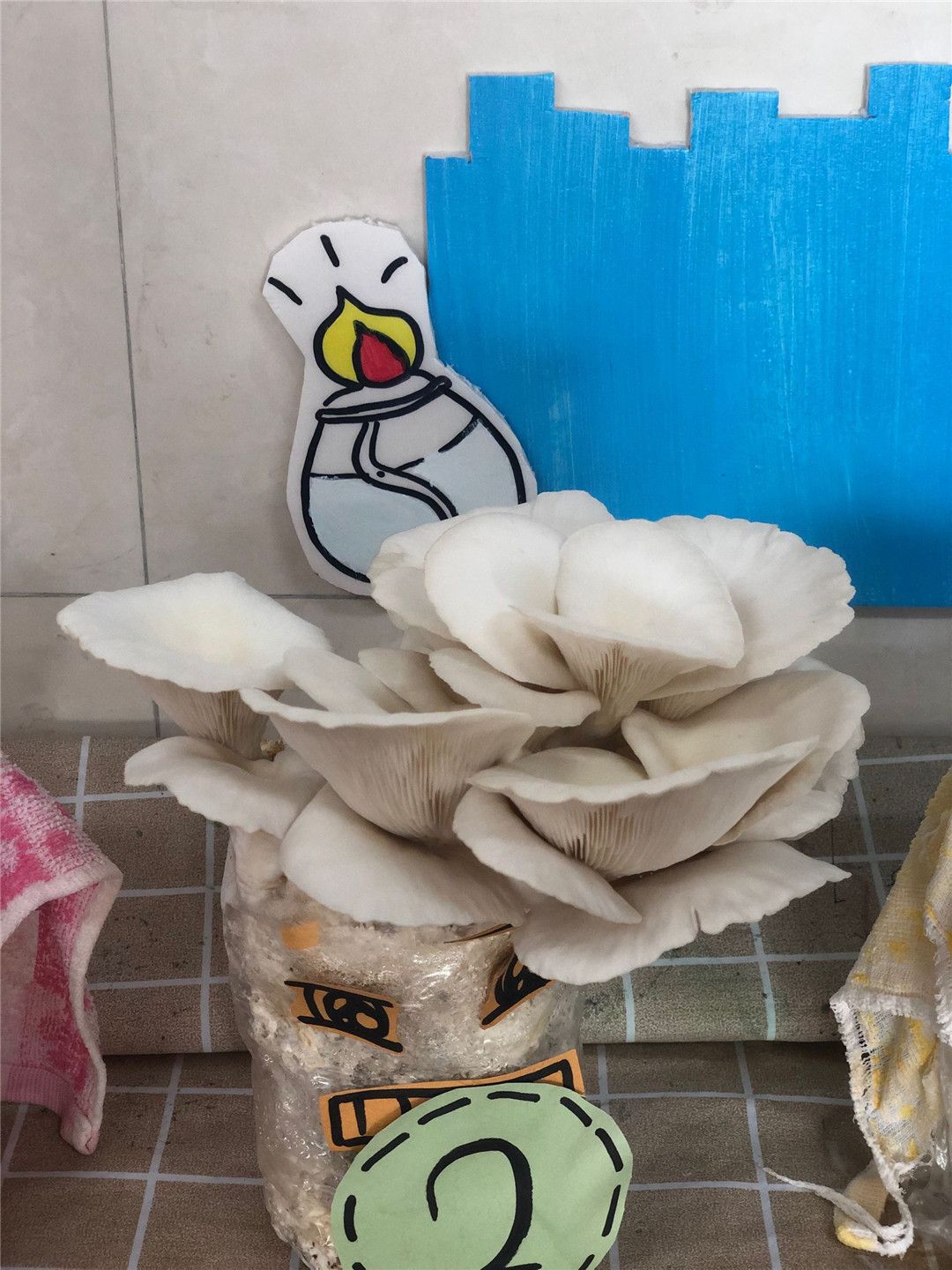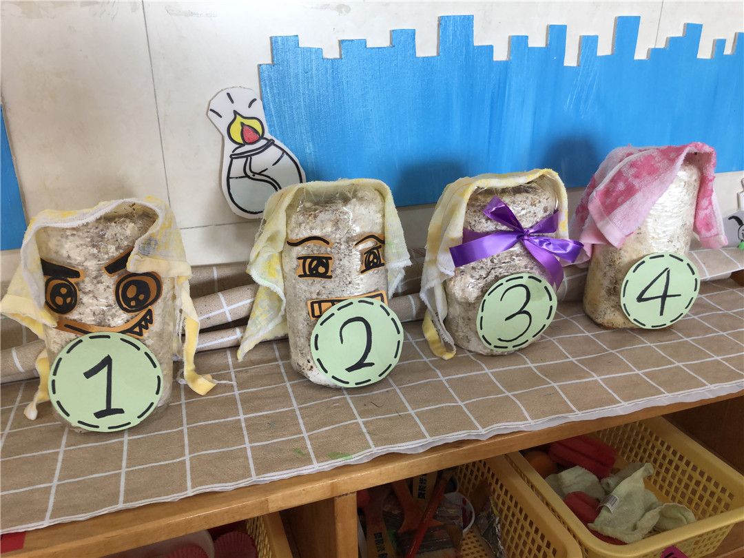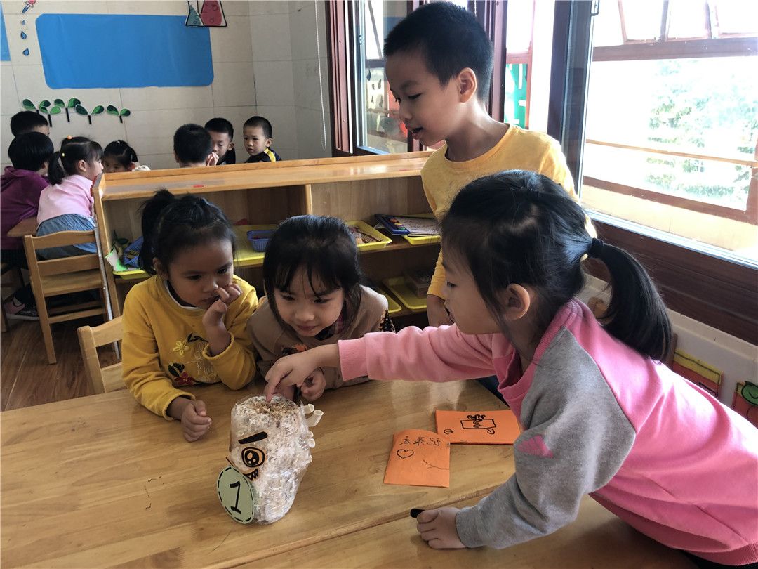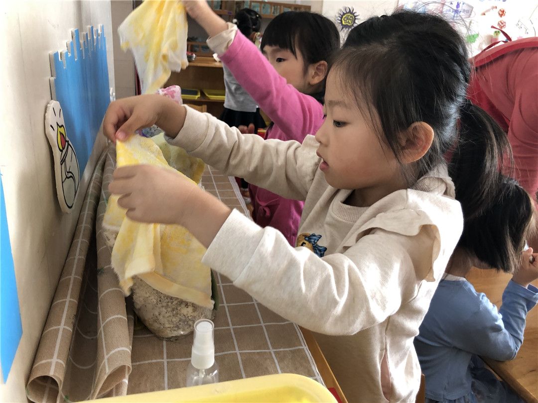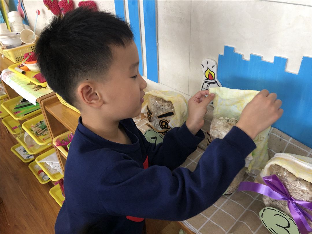 接下来的一段时间孩子们精心的照顾着蘑菇菌棒。每天不定时都能看到孩子们帮蘑菇菌棒浇水、盖布、观察的身影,孩子们生怕错了每个蘑菇菌成长的环节。