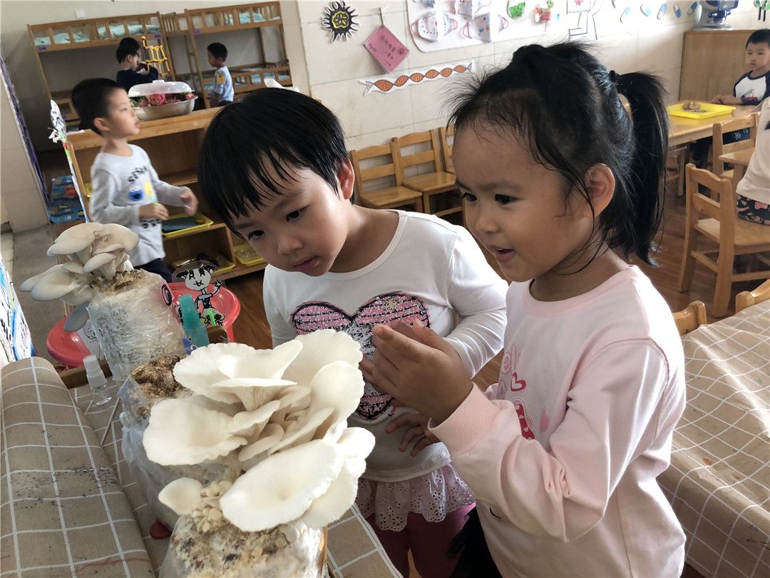 雨后的潮湿天气,孩子们发现幼儿园小山坡上长出了几朵小蘑菇。孩子们虽然见过、吃过蘑菇,但对于蘑菇的生长过程却一无所知,“到底蘑菇是怎么长出来的?”“它的种子是什么样子?”“哪里有蘑菇种子?”一系列的问题接踵而来,为了进一步引起了孩子们的探索兴趣,老师建议孩子们可以网上购买蘑菇菌棒回来一探究竟。、
