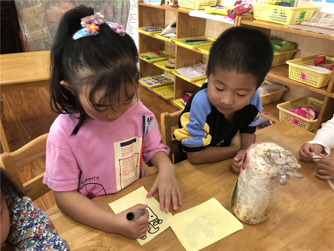 当收到了蘑菇菌棒时,孩子们争先恐后的要看个究竟,“蘑菇就是这样的吗?这怎么长出来啊?它怎么这么脏啊?”“我们要怎么照顾它呢?”于是,孩子们和老师一起讨论如何着如何照顾菌菇,随后孩子们认真仔细做着菌菇培养计划。