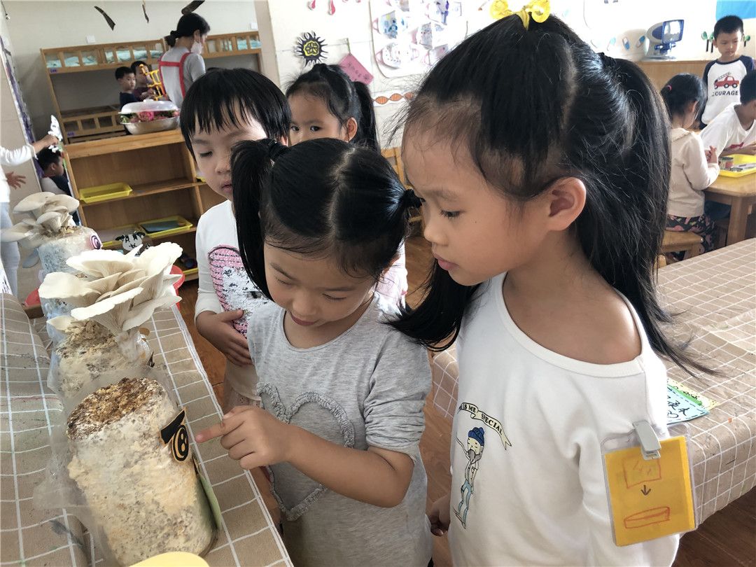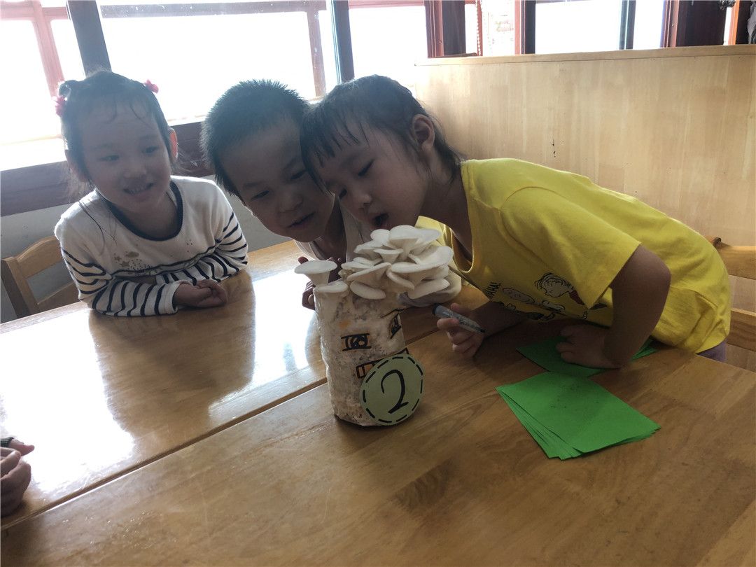 在孩子们耐心的等待中蘑菇的生长了!“为什么第二小组照顾的蘑菇菌棒长出了蘑菇,我们小组长不出来呢?”孩子们自主发现问题,认真的察着蘑菇成长的秘密。原来菌菇喜欢潮湿的环境,一定要保持蘑菇菌棒周围潮湿,盖在上面的布要有水分,而且原来白平菇生长的时候不是所有菇一起长大的,有的大、有的小,白平菇可以分批采摘。在观察中,每个孩子都仔细的做着观察记录。在收获第一批菌菇后,孩子们继续期待着。