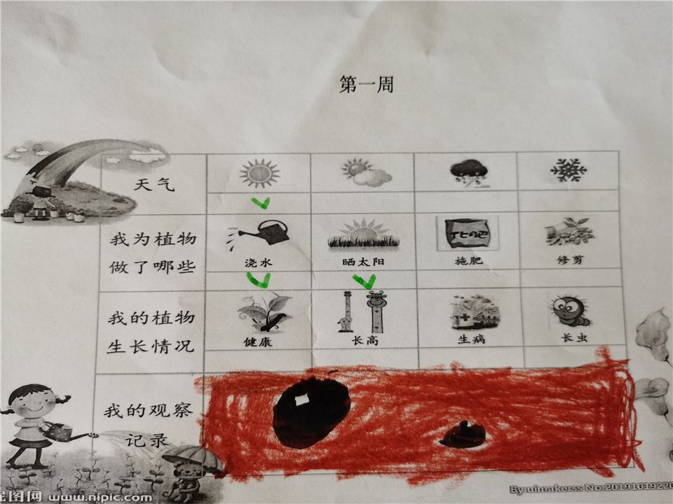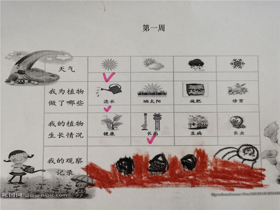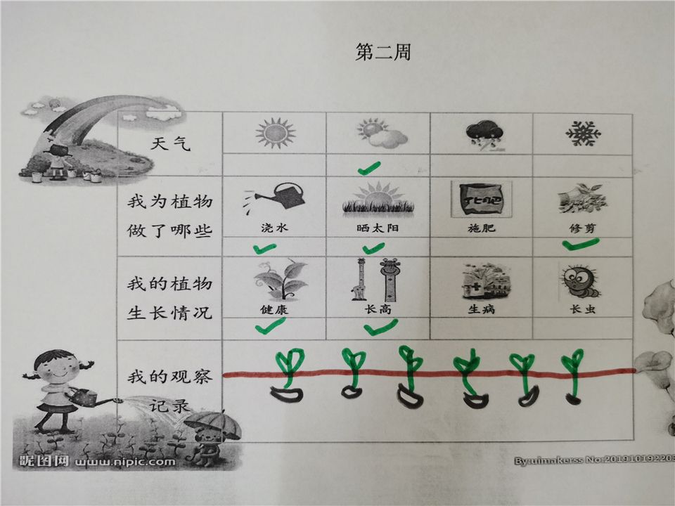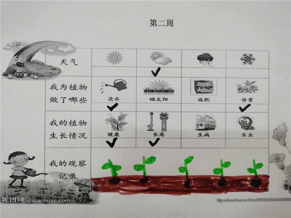 一周之后的清晨,孩子们又来到了菜地,他们开心地发现他们亲手种下的种子已经发芽了!这个时候有孩子提议说让我们把种子发芽、成长的过程记录下来,第一周、第二周......就这样,孩子们每一周都会认真地记录着种子的成长过程。