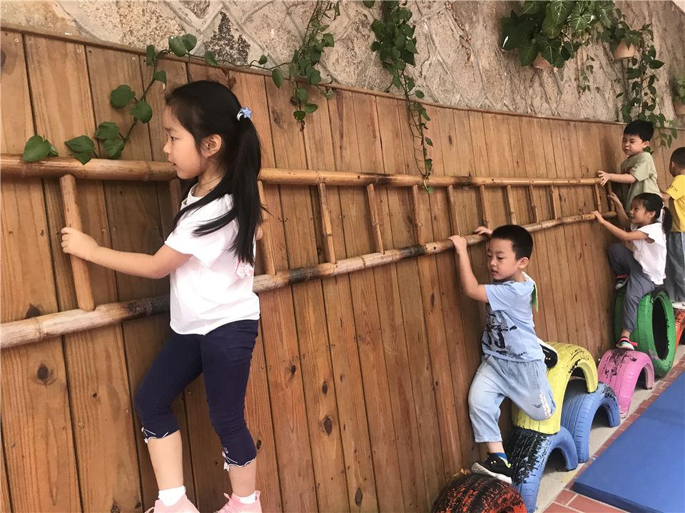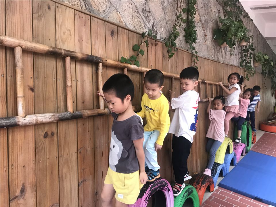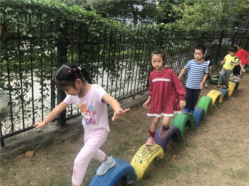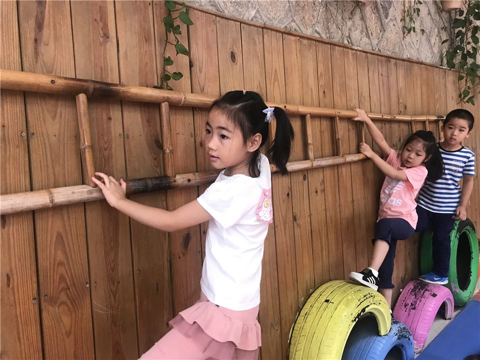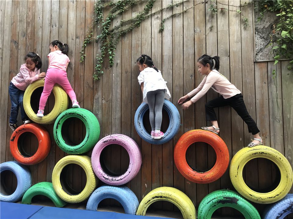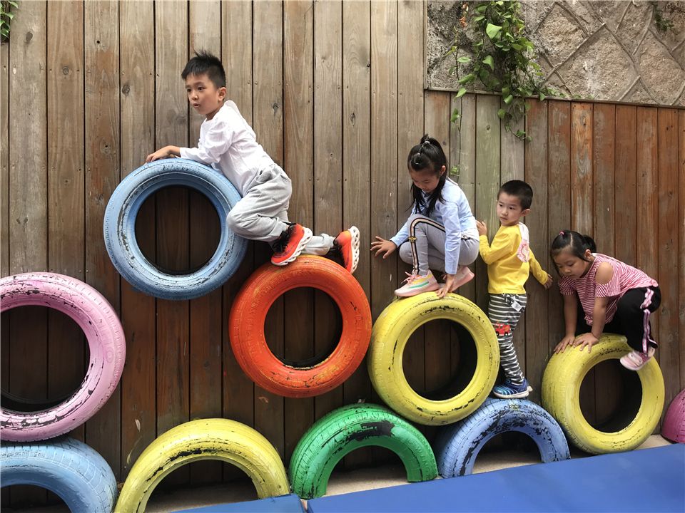 彩色的轮胎钉在墙上,高高低低,不仅好看,而且好玩。大班的小朋友敢于挑战,轮胎墙可是他们的最爱。