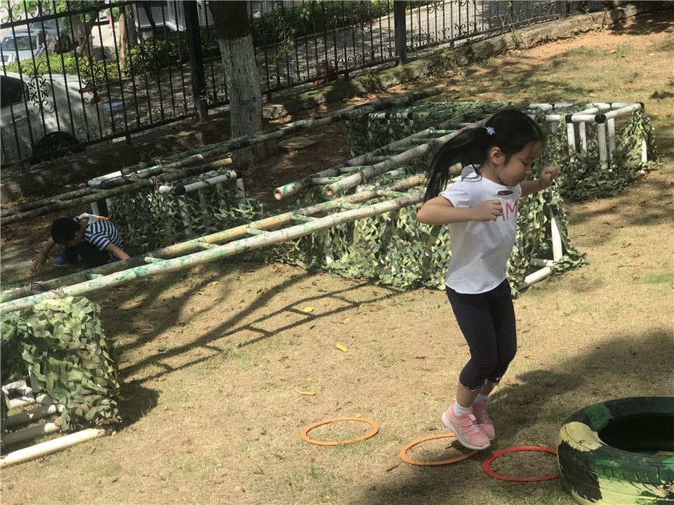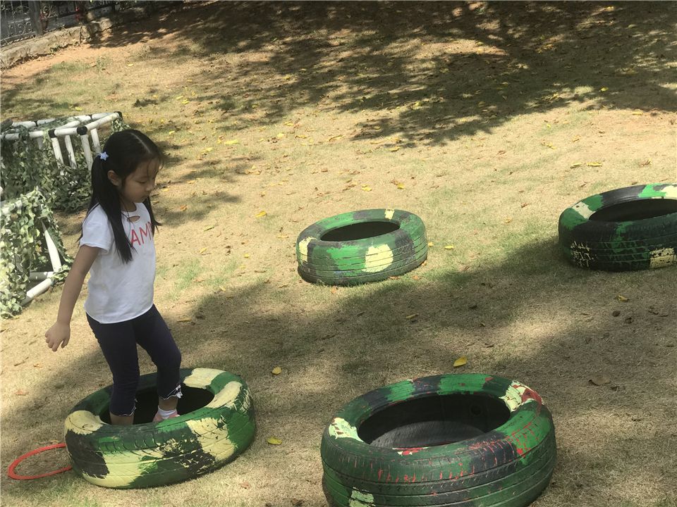 相对轻松的跨、跳轮胎,一点都难不倒大五班的小朋友们。瞧,小朋友一跃而起,动如脱兔。