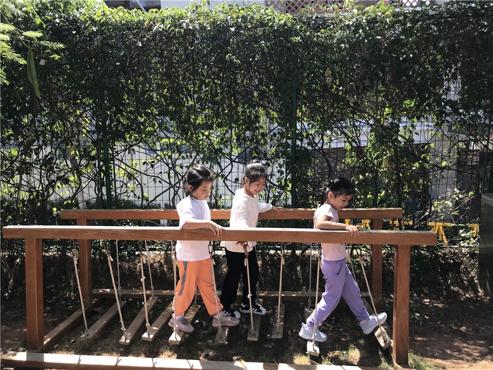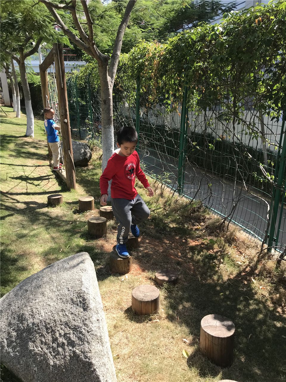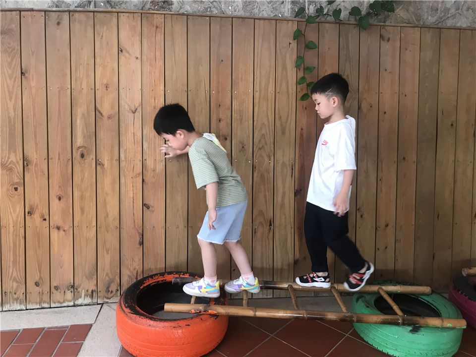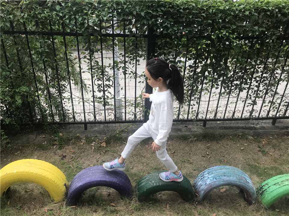 曾经还需要请小朋友和老师扶着才敢往前走的“小不点”,一下子变成了全园最大的小朋友,不仅敢在轮胎桥上走,还敢一边走一边转圈圈,太厉害了!