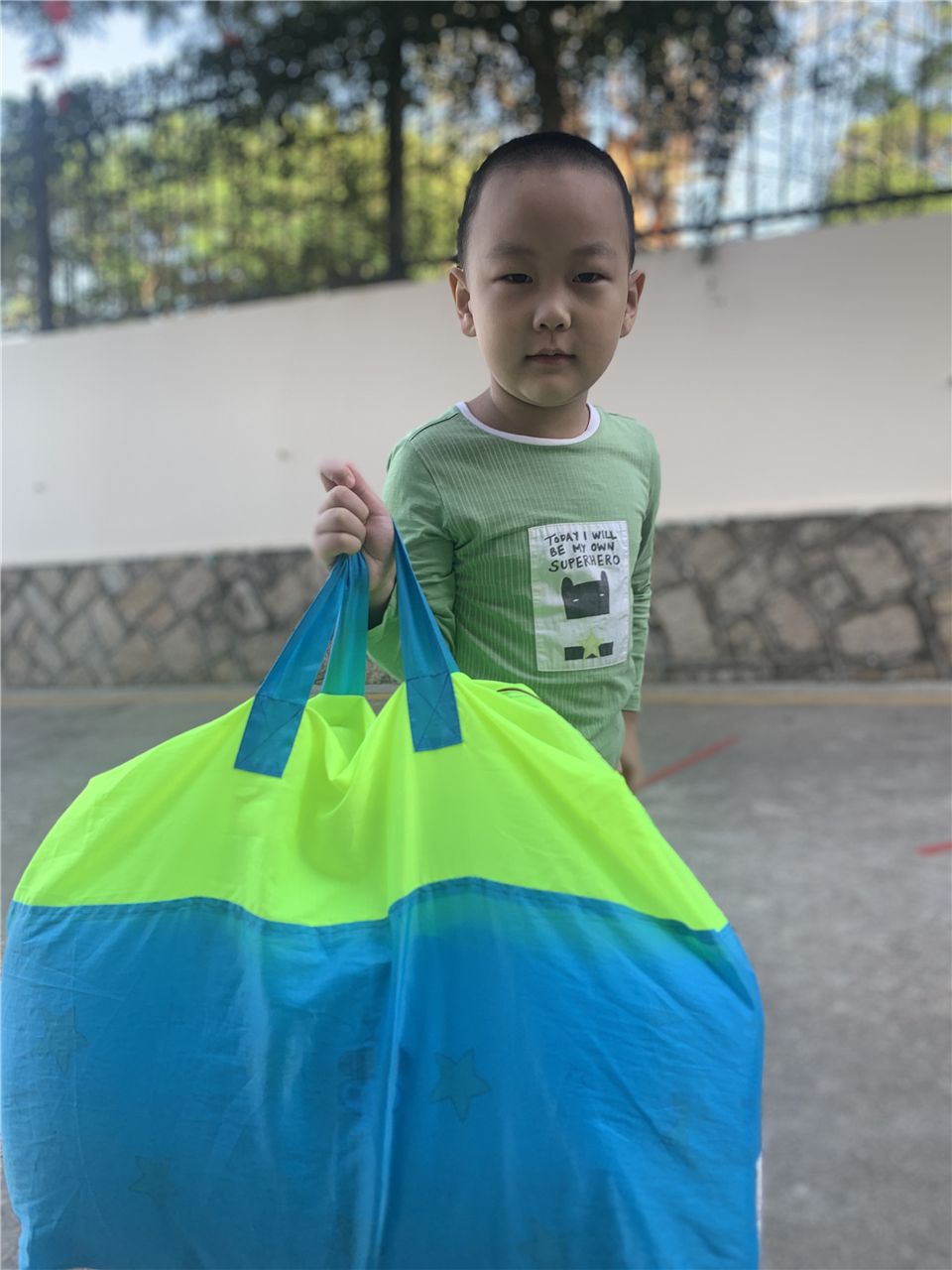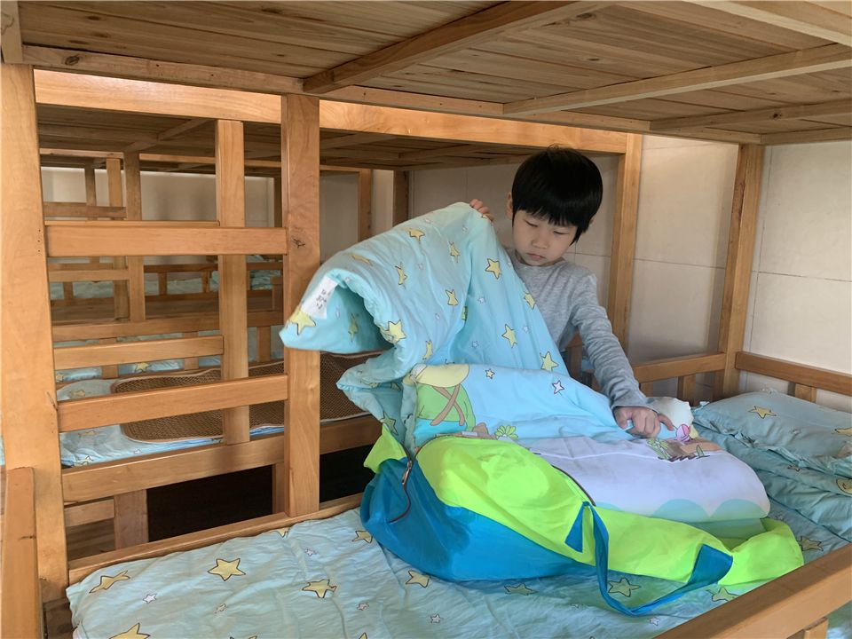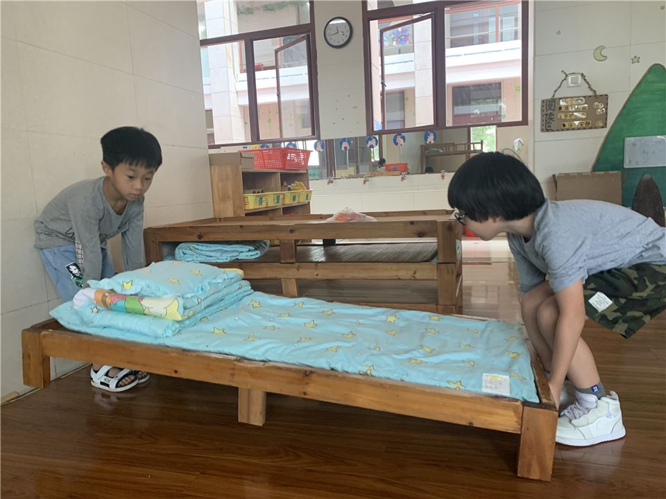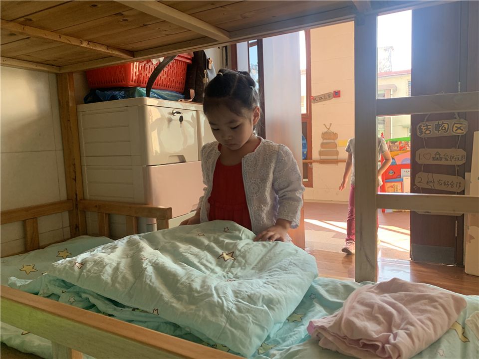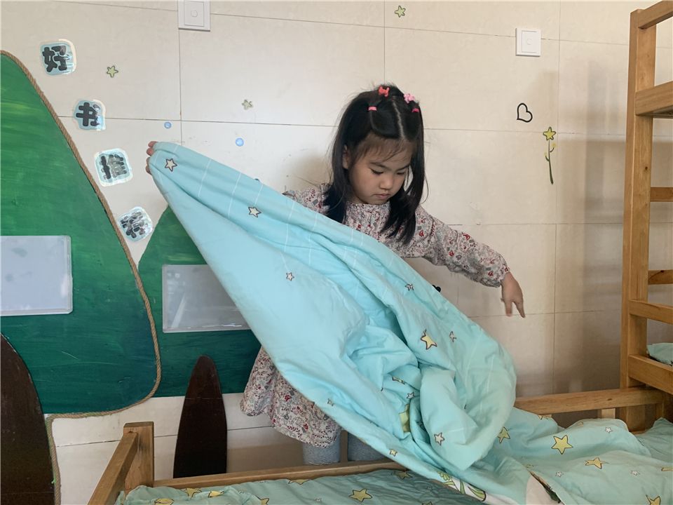 看,小小被子肩上扛!爸爸妈妈放心吧,我们还会自己铺床,不要小瞧了我们!
