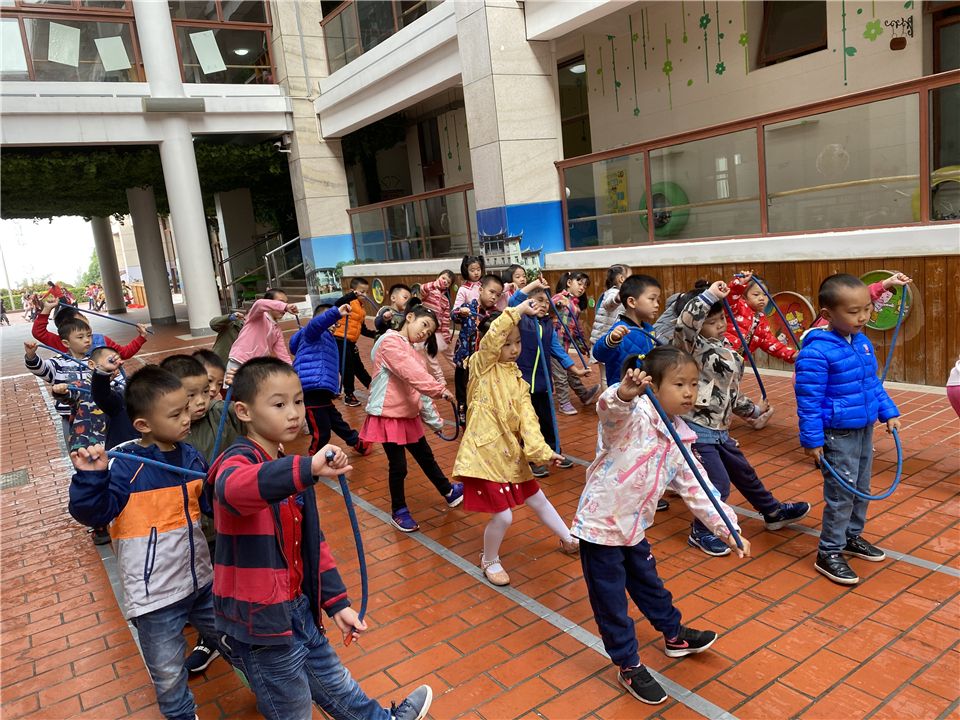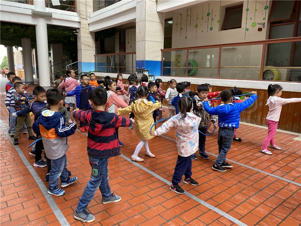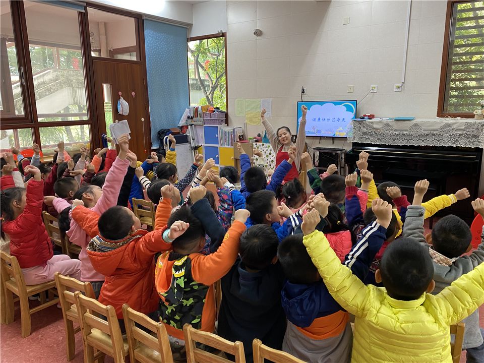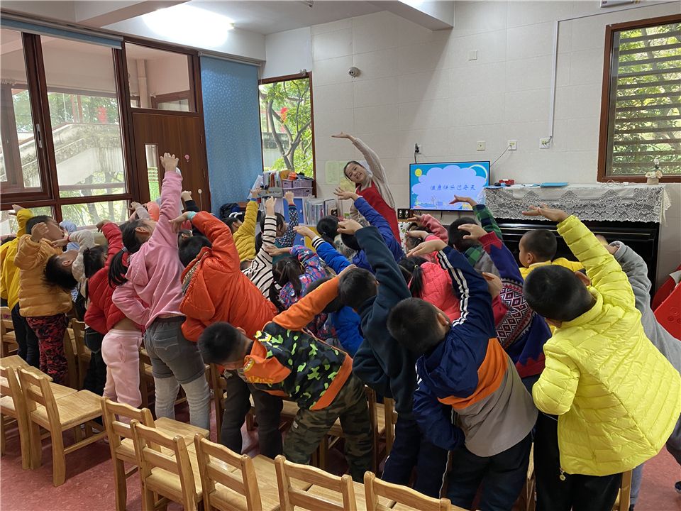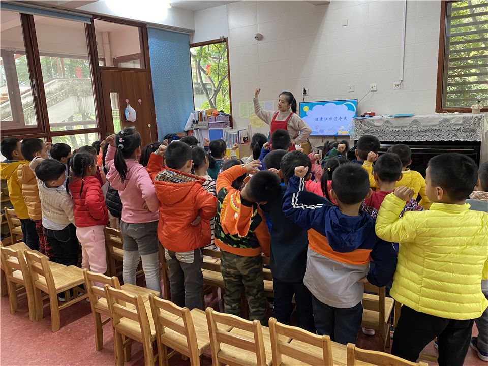 张老师正带着我们进行集中活动讨论,她说:“我们要如何才能健康快乐地度过这个冬季呢?”“要多运动!”我们不约而同地说道。“没错!现在请你们起立,先跟张老师一起动一动!”