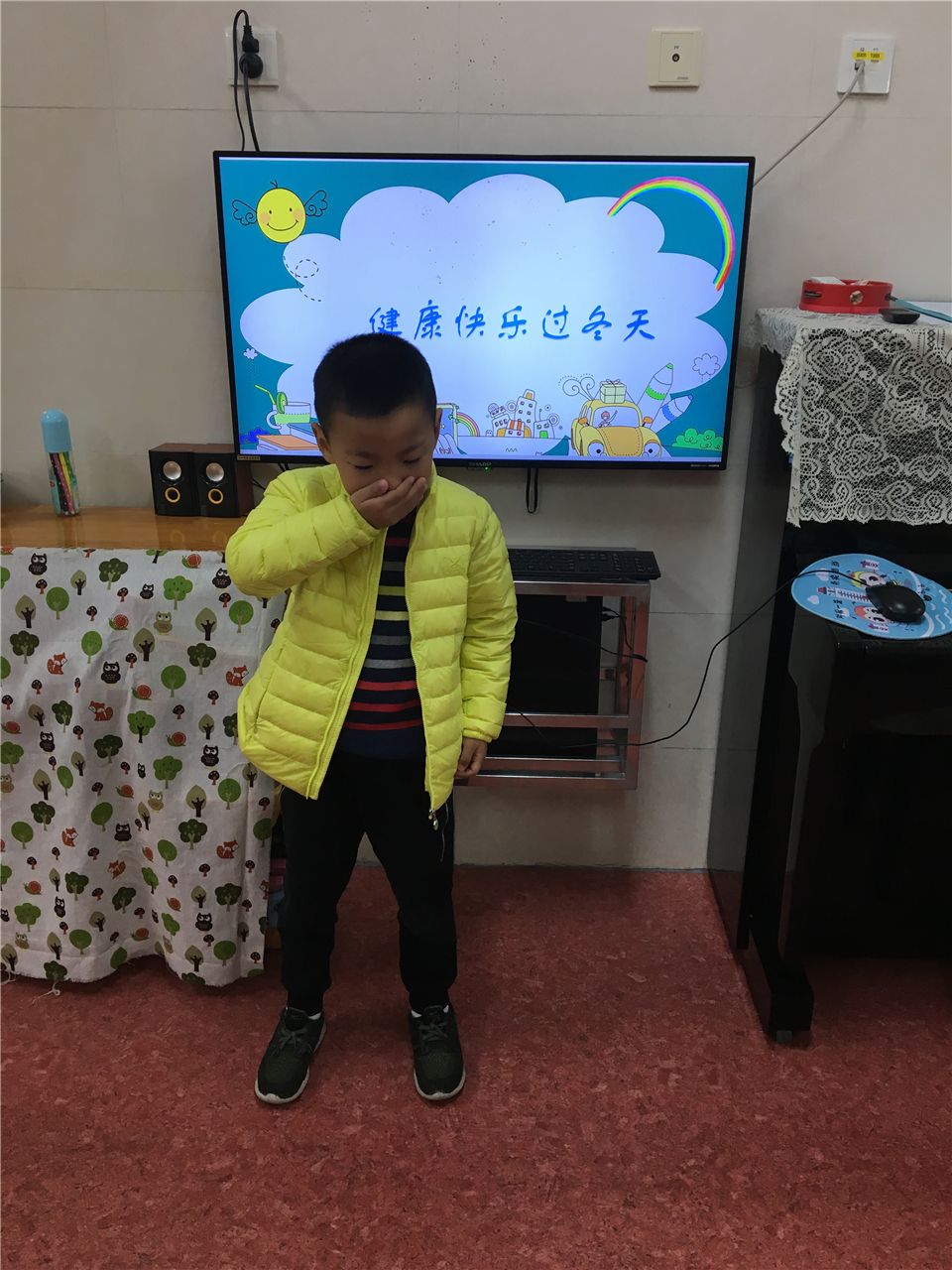 小辰也举手上台,他告诉大家,我们打喷嚏的时候,要像这样捂住口鼻。