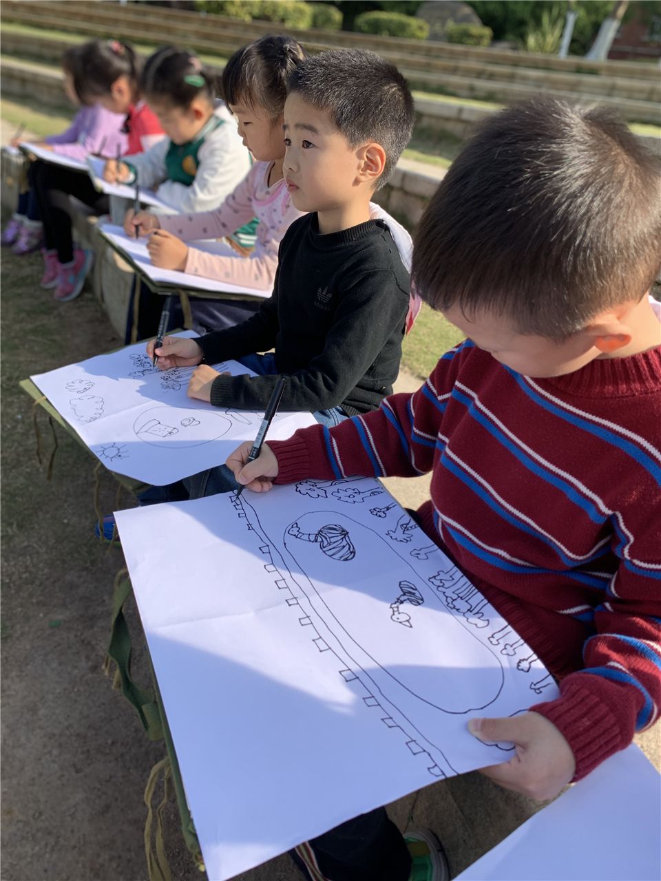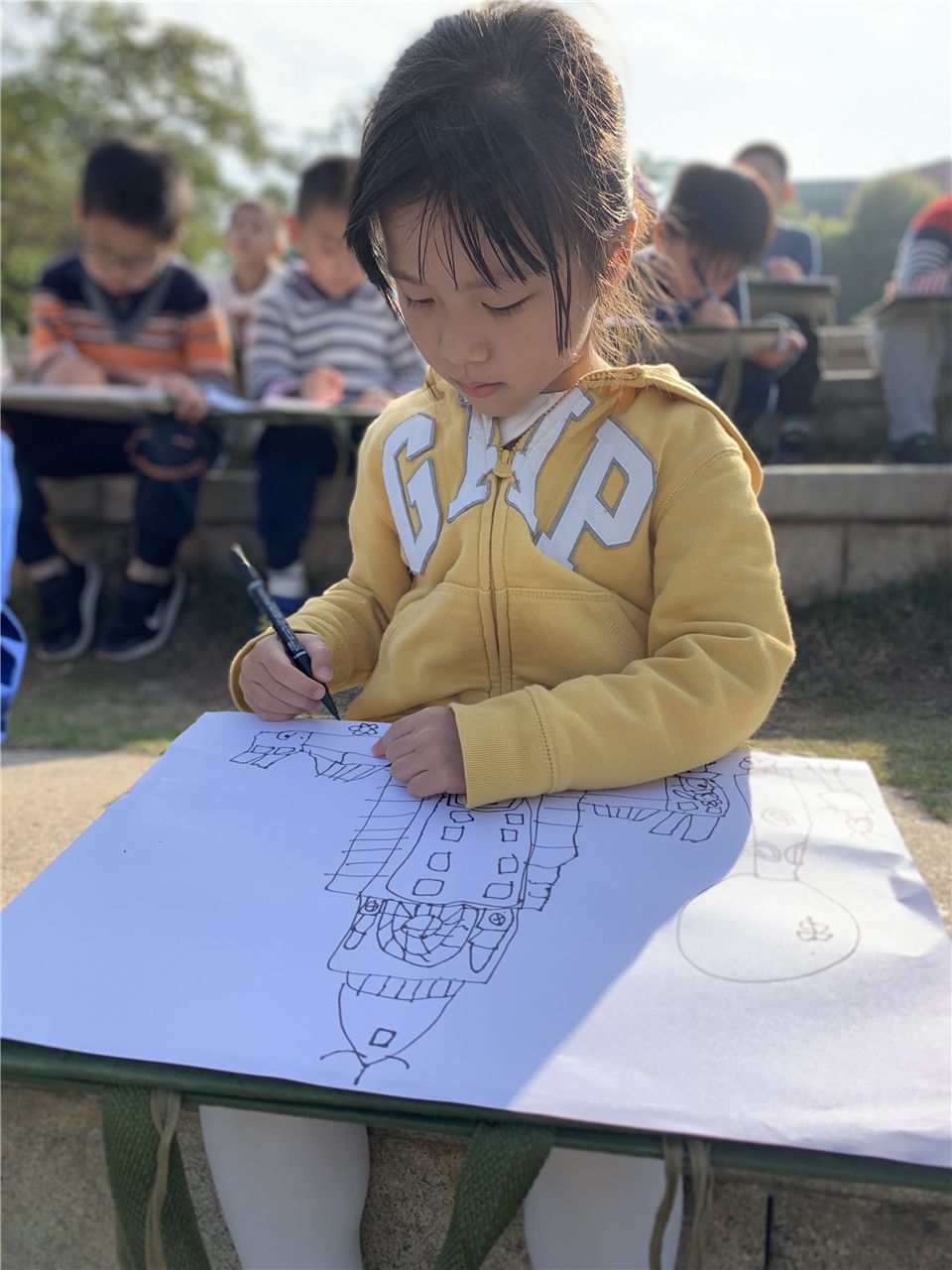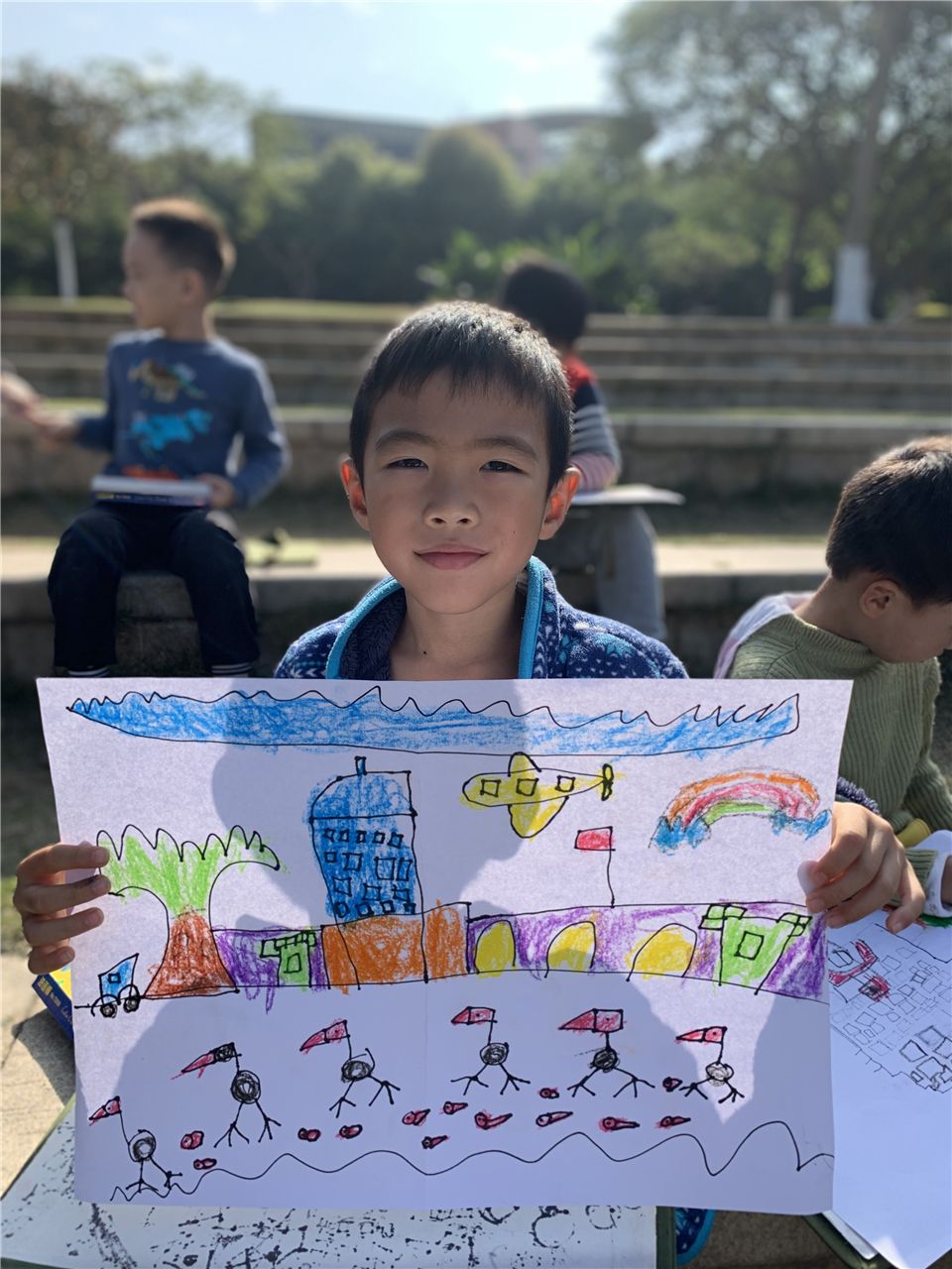 时间静静流逝,在小朋友们的画笔、水彩笔下,大四班小朋友们的第一张写生画诞生了。看,孩子们自信笑容彰显了这次外出写生活动带给小朋友们的快乐。