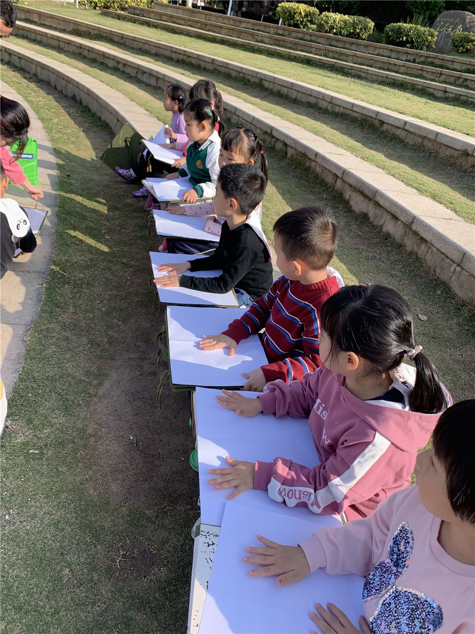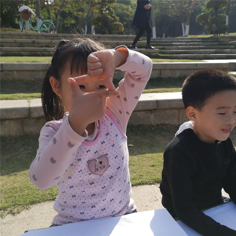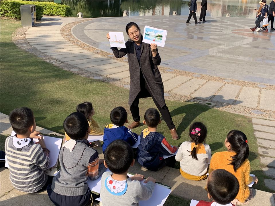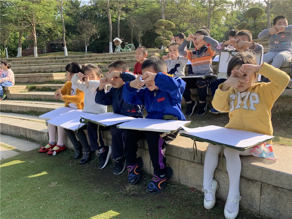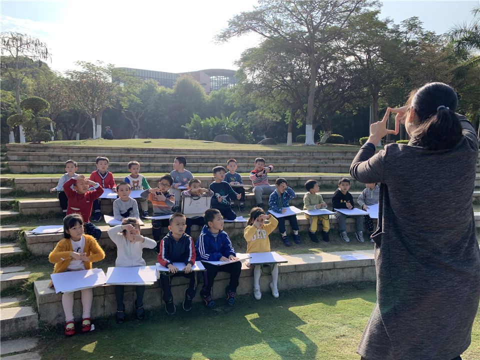 “来,请小朋友用小手做出开枪的手势,再把其中一把小手枪倒过来,两把小手枪合在一起,变成一个取景框......”在宇博妈妈生动、形象的比喻引导下,小朋友们纷纷用手势进行了取景:芙蓉湖、黑天鹅、嘉庚广场......冬日的暖阳打在一张张专注的小脸上,仿佛一群小画家。