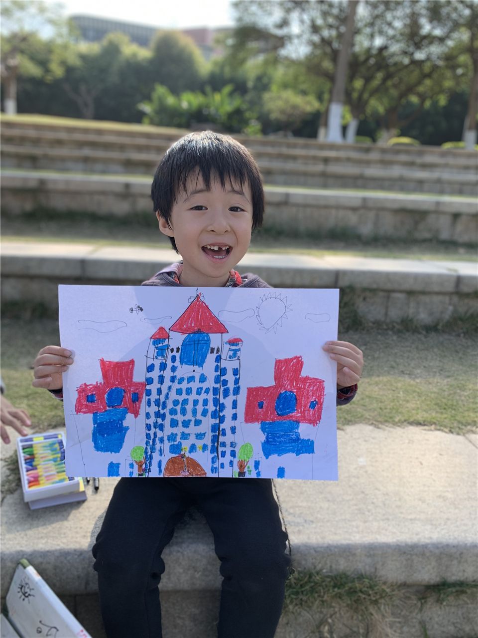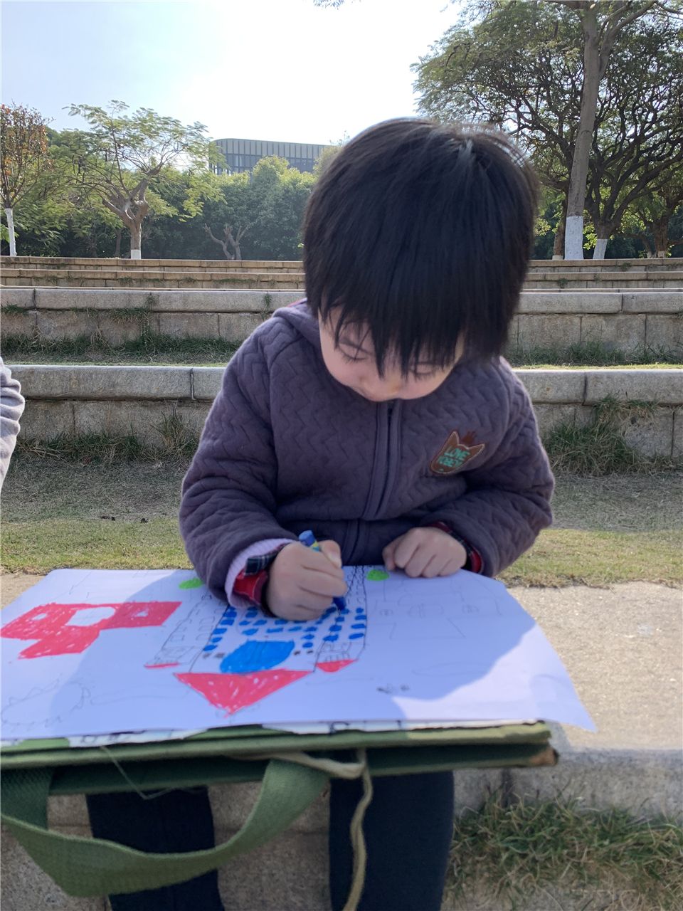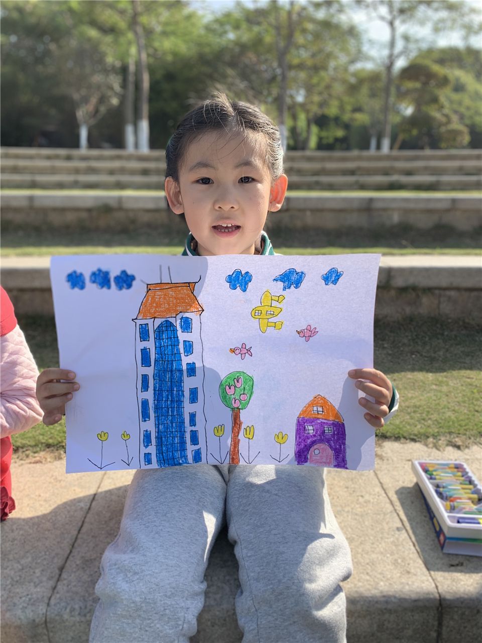 取好景,小朋友们打开画板,开始作画啦!士轩小朋友拿起黑色的油画棒自信落笔,朱莉小朋友默默思索了一番才下笔,思赫妹妹对嘉庚广场的主楼最感兴趣,因为那是妈妈上班的地方......每个孩子都格外专注、用心画着心中最美的风景。