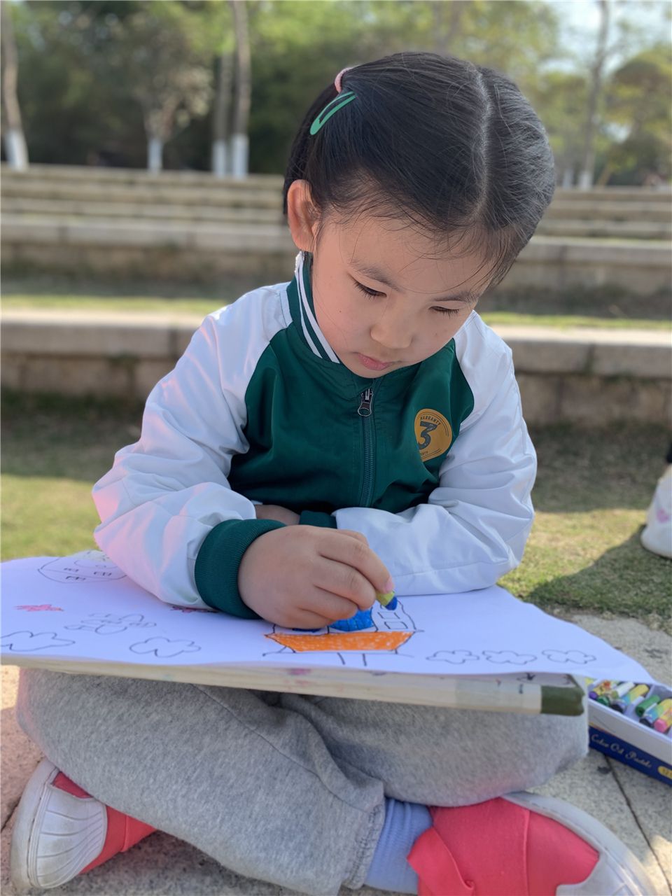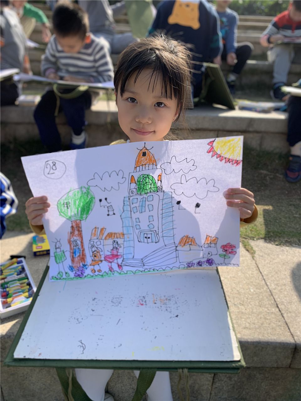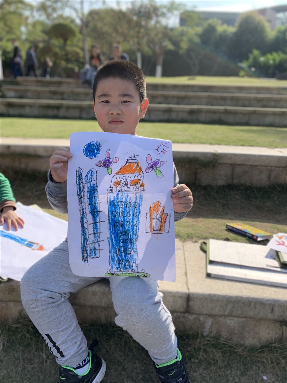 取好景,小朋友们打开画板,开始作画啦!士轩小朋友拿起黑色的油画棒自信落笔,朱莉小朋友默默思索了一番才下笔,思赫妹妹对嘉庚广场的主楼最感兴趣,因为那是妈妈上班的地方......每个孩子都格外专注、用心画着心中最美的风景。