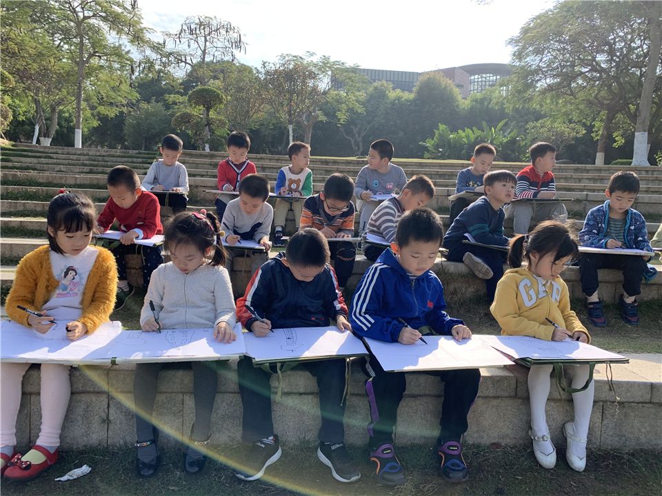 在美丽的芙蓉湖畔环形台阶坐下来,宇博小朋友的妈妈是美术学院的老师,今天宇博妈妈来教小朋友怎样写生。宇博妈妈先展示了很多厦大周边的风景写生画,请小朋友们辨认、观察,看看写生画都有些什么特征。