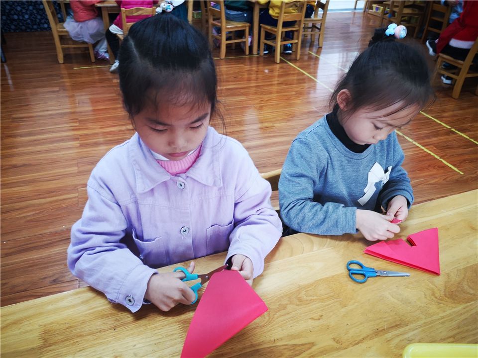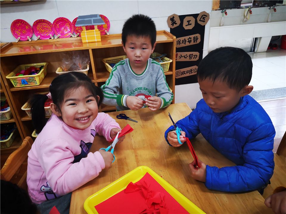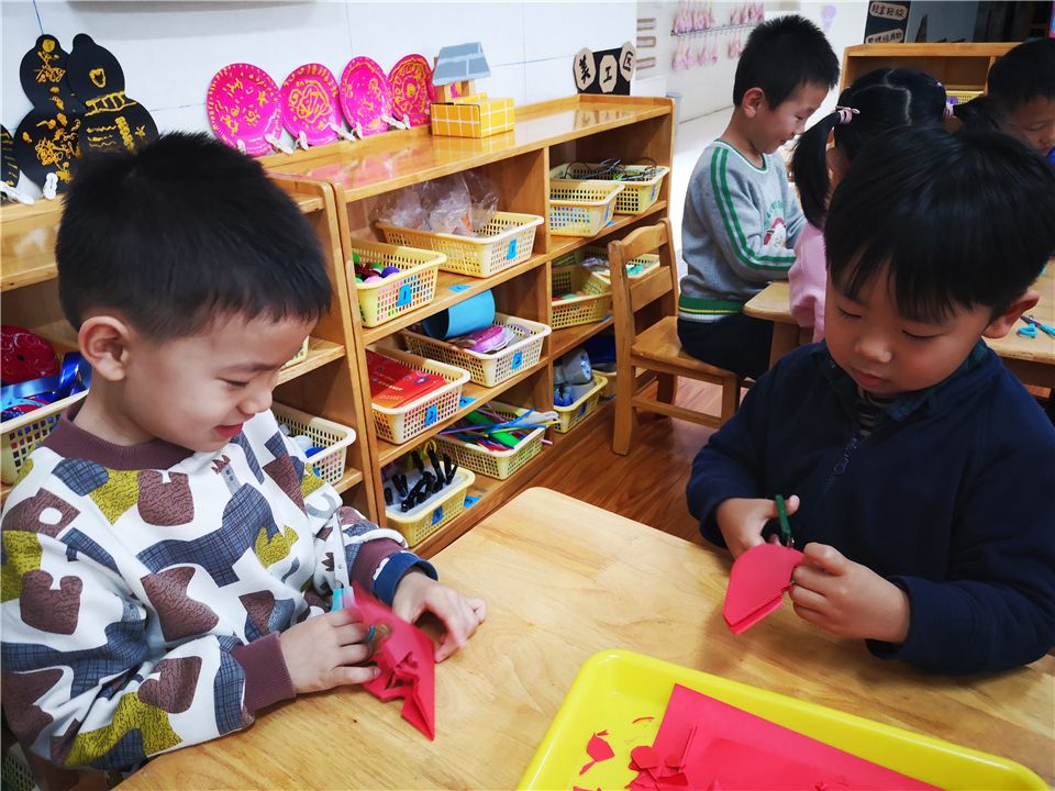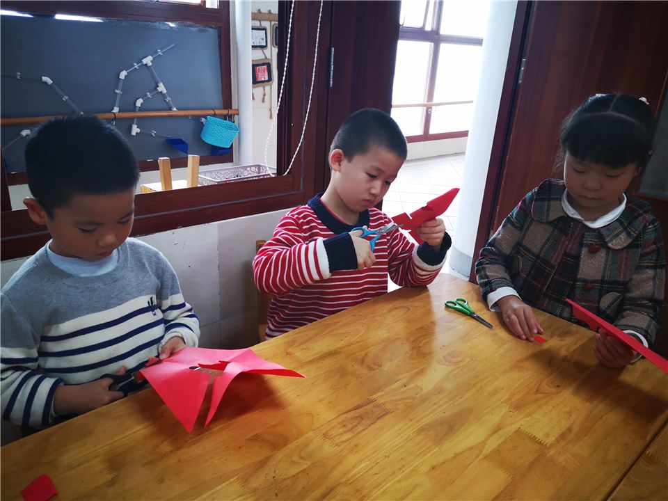 伴随着新年快乐的乐曲响起,宝贝们通过,折、画、剪等方法,把一张张火红的彩纸变成了漂亮精致的窗花,每当有小朋友拆开自己剪的剪纸时,时不时能听到宝贝们惊喜和快乐的声音。