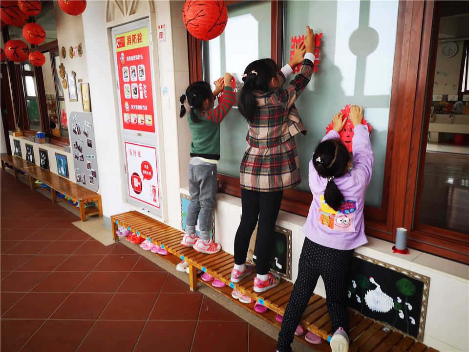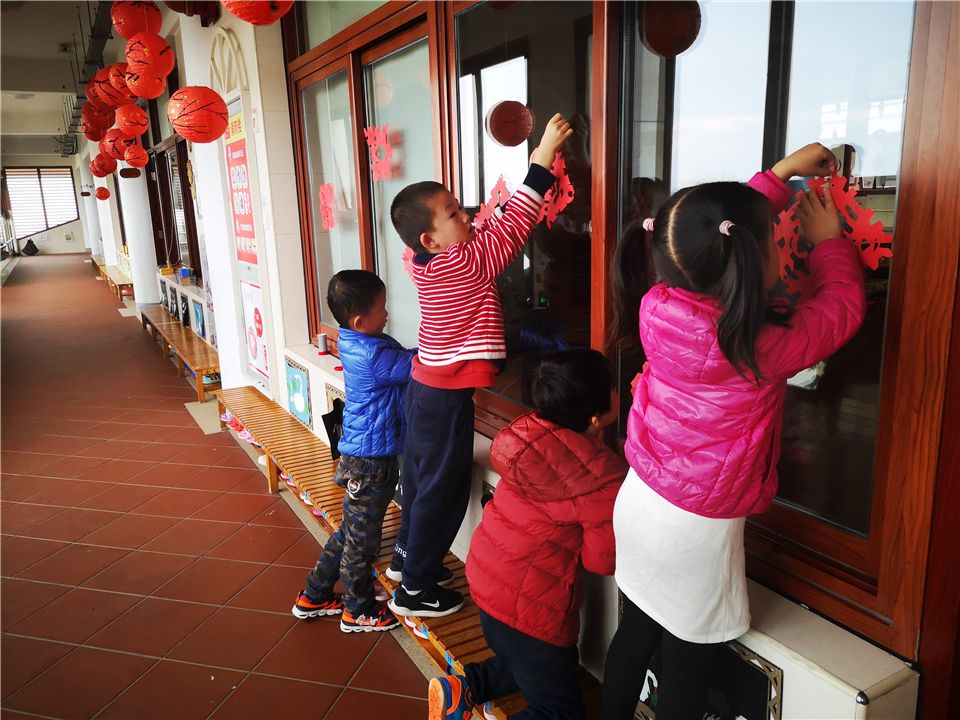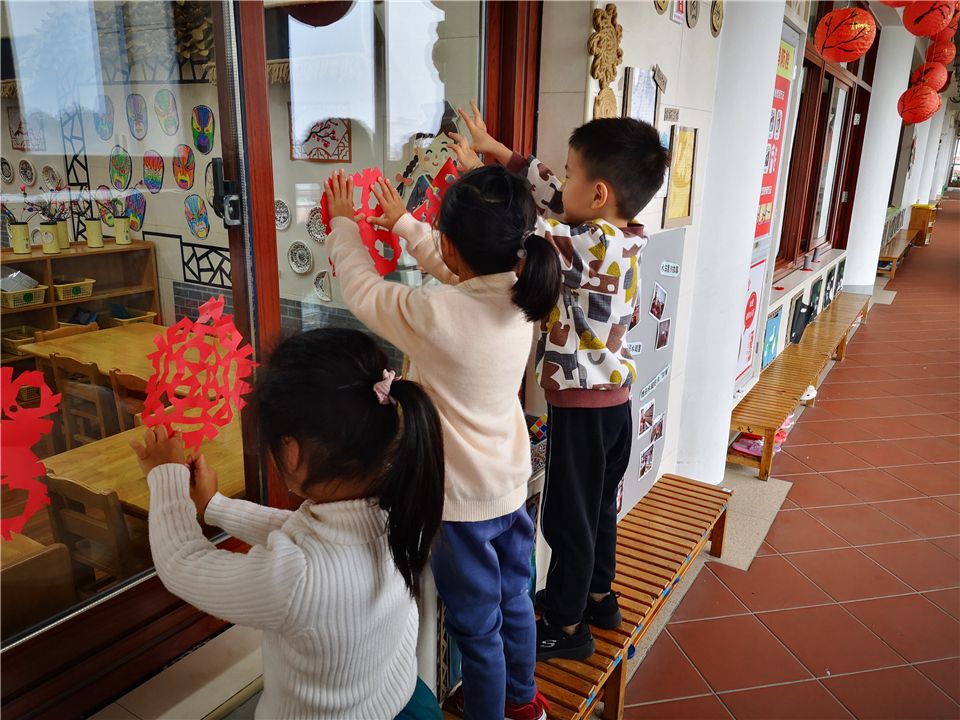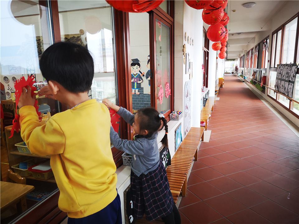 宝贝们在经过老师的同意之后,纷纷拿着自己制作的剪纸窗花,贴在窗户上。
