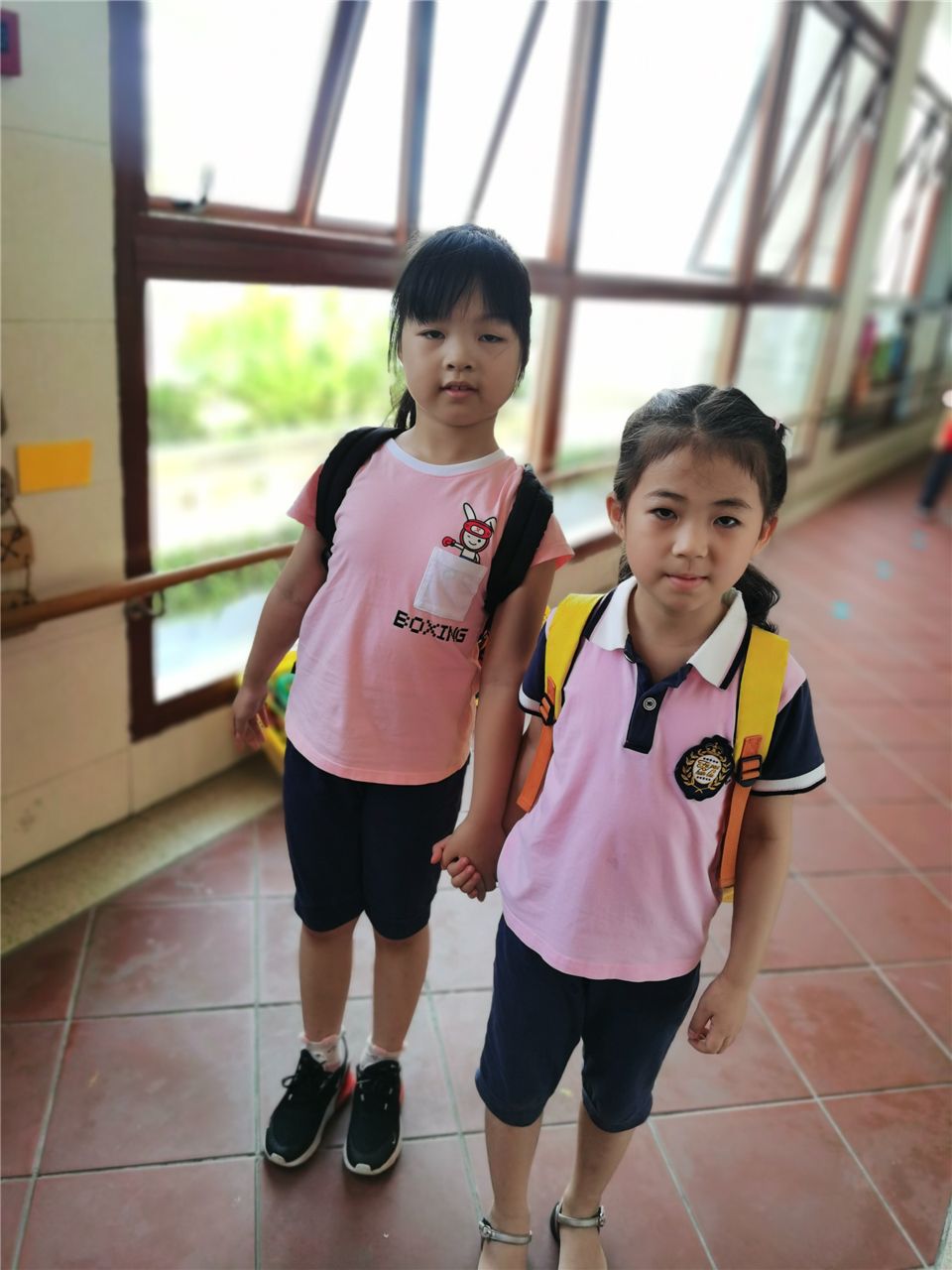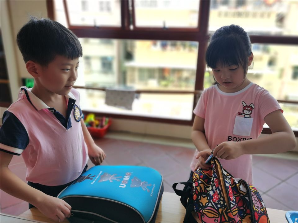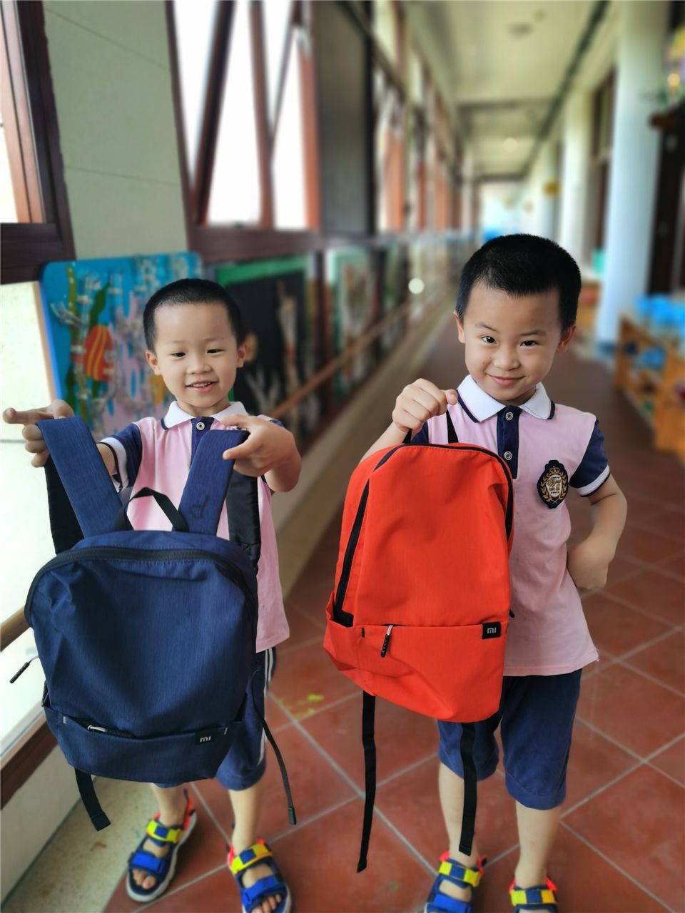 皮皮:书包是我们自己选的,我喜欢蓝色,蛋蛋喜欢橙色。