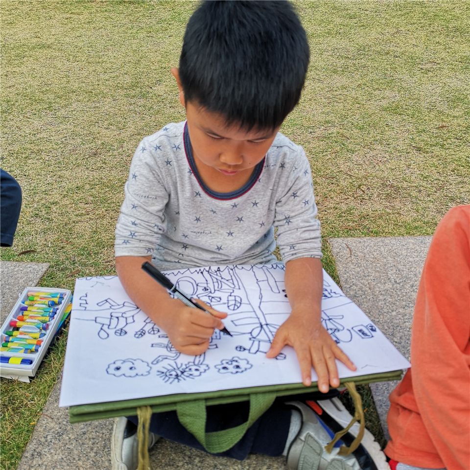 萌娃们计划好自己想画的景色后,排排坐在石阶上开始创作。
