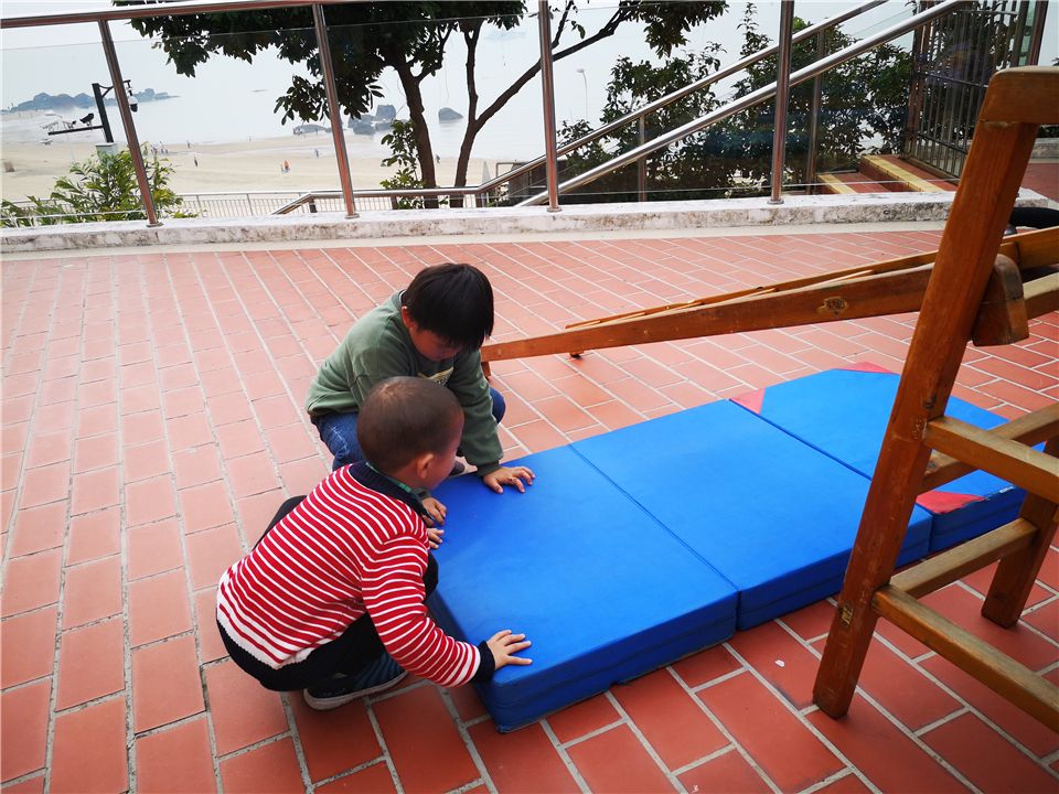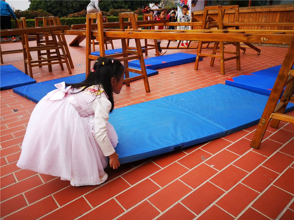 木梯搭好了,为了安全起见,让我们铺上体操垫吧!这样我们玩起来才更安全,更放心。