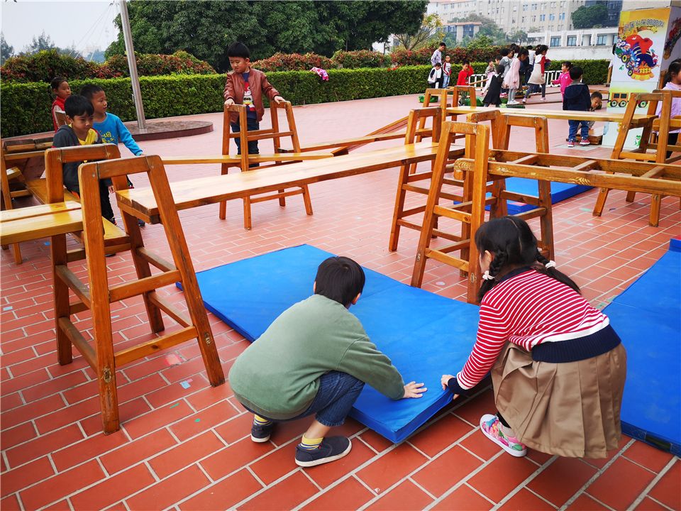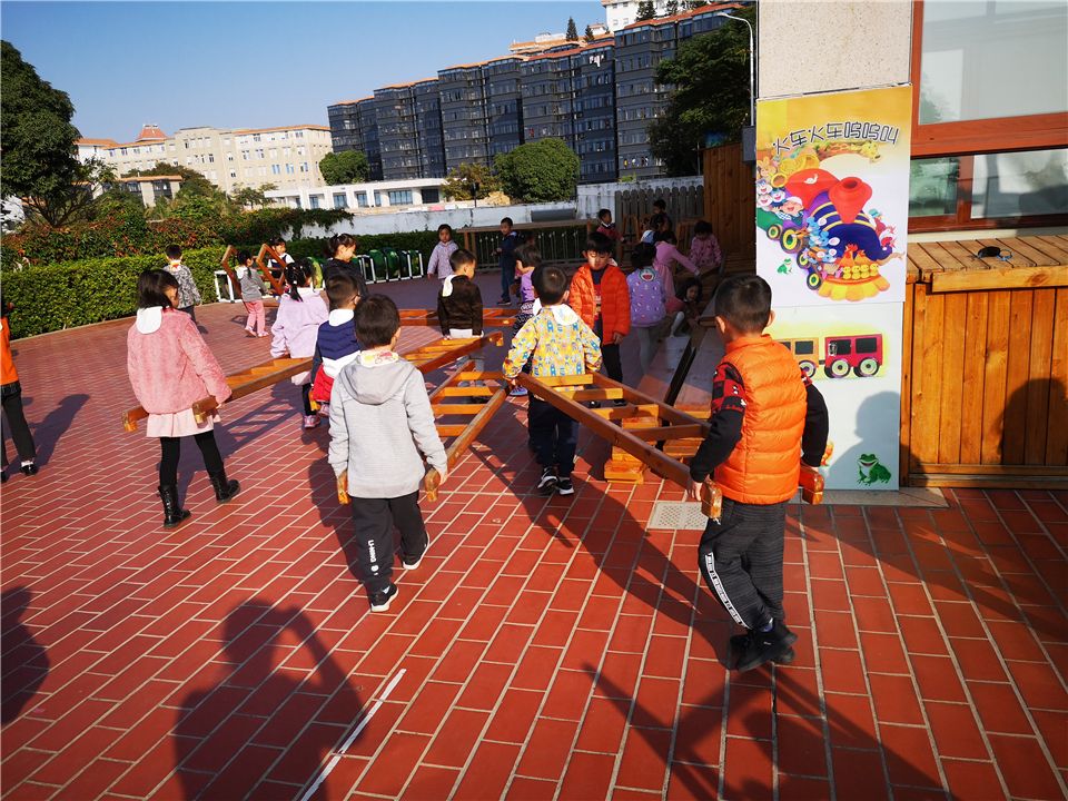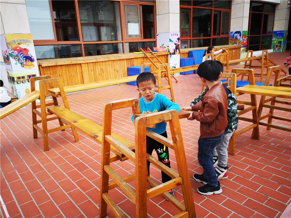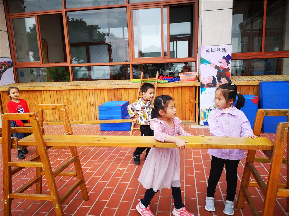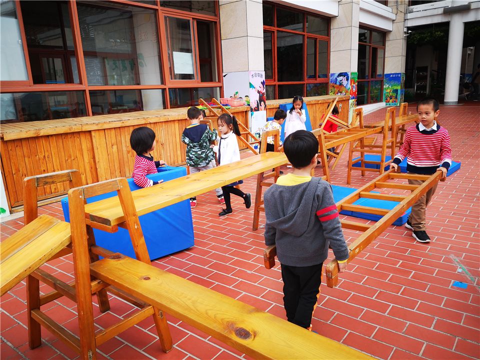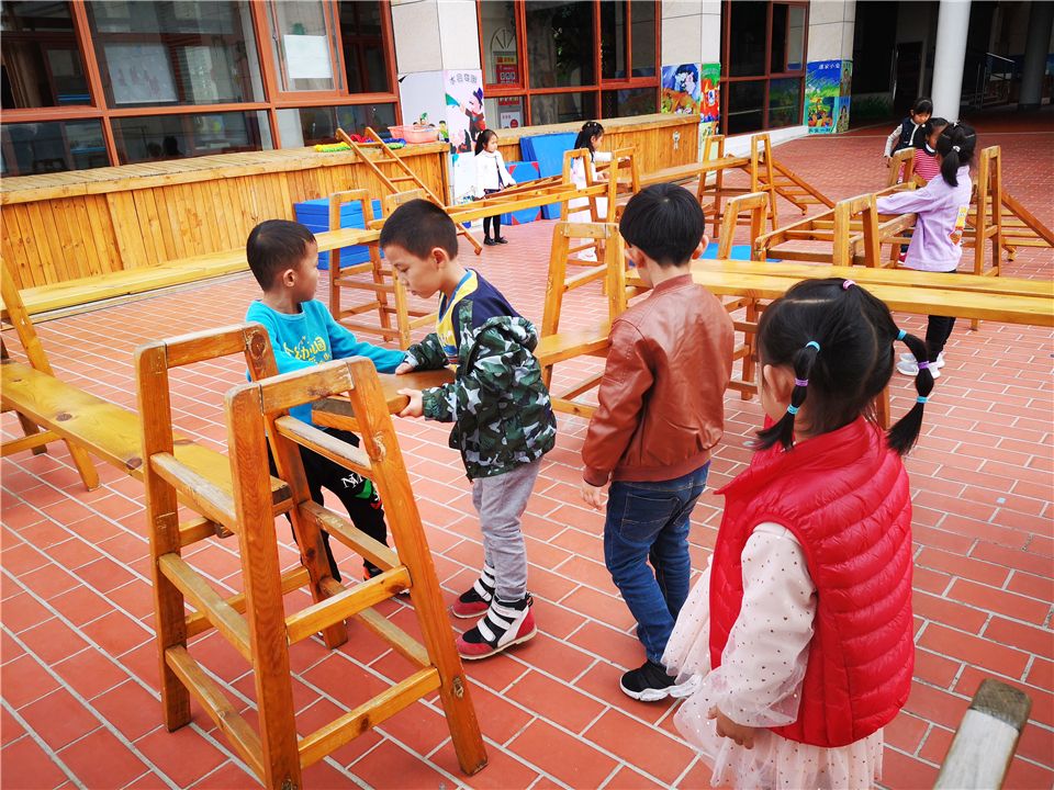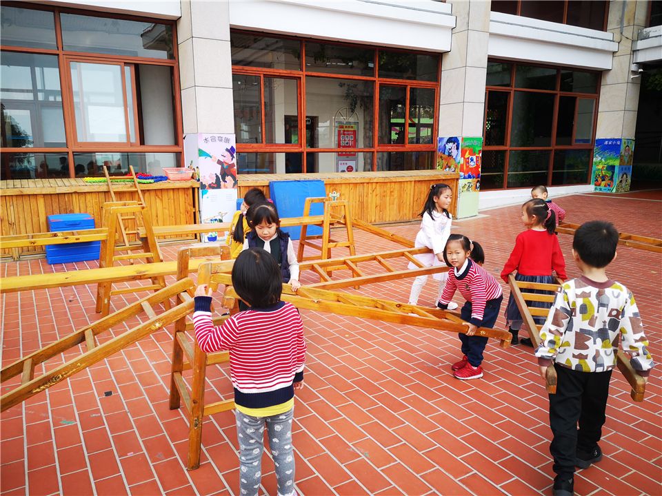 那边几个孩子正在小声商量着。“我们把木梯连着在一起吧”“好啊,我们来搭个最长最长的高架桥。”说做就做,孩子们开心的用木板把高架桥连在了一起,其他小伙伴看到了,也加入了他们的队伍。