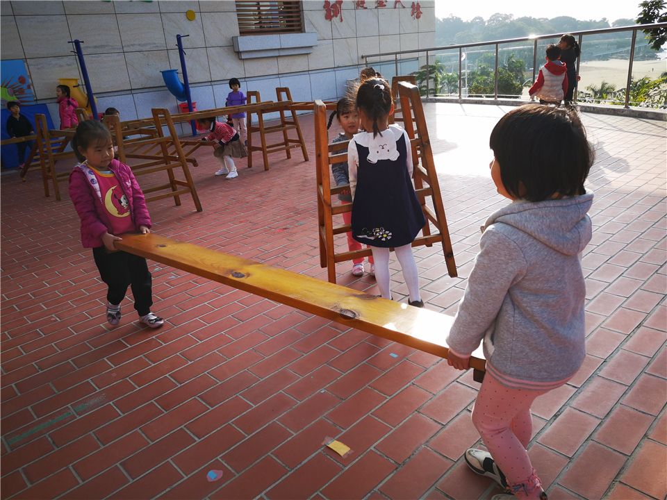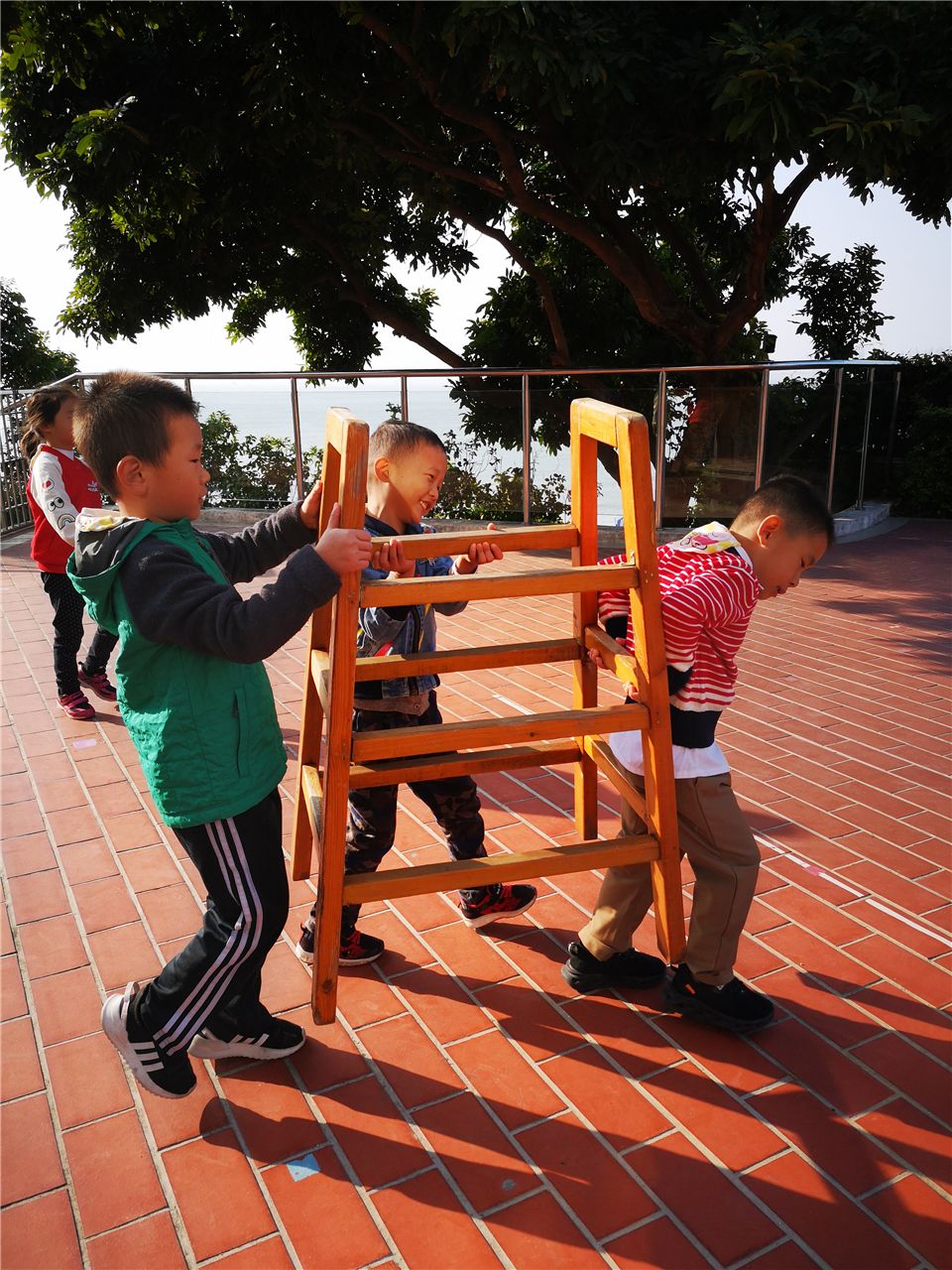 这边,孩子们三三俩俩的合作,一起搬运木梯。这时,小正把木梯往高架子上架,小说:“你要把那头抬高一点”架上之后,还用手拍了拍木梯。