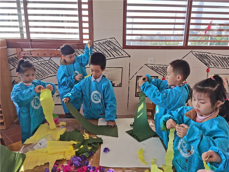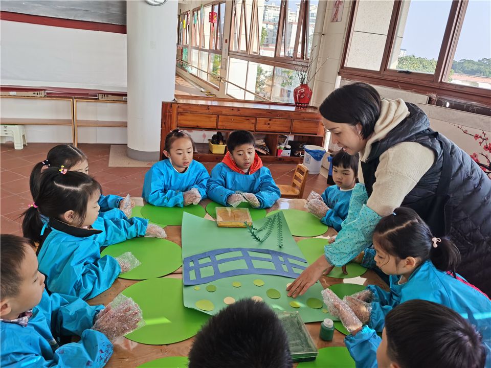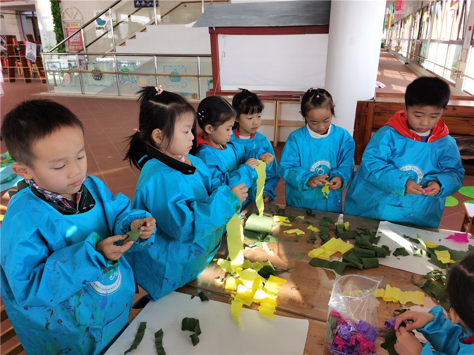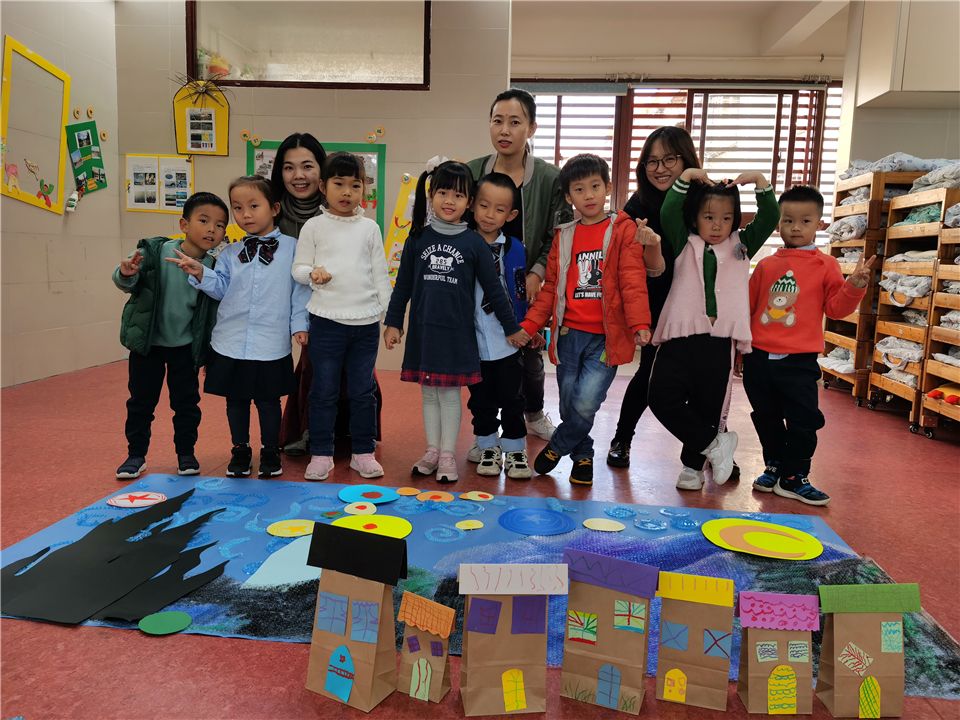梵高的名作《星空》中有些什么?那闪烁的星河,夜空中闪烁的星星,星空下的房子,都在孩子们的集体画笔涂画、纸袋贴画中产生。