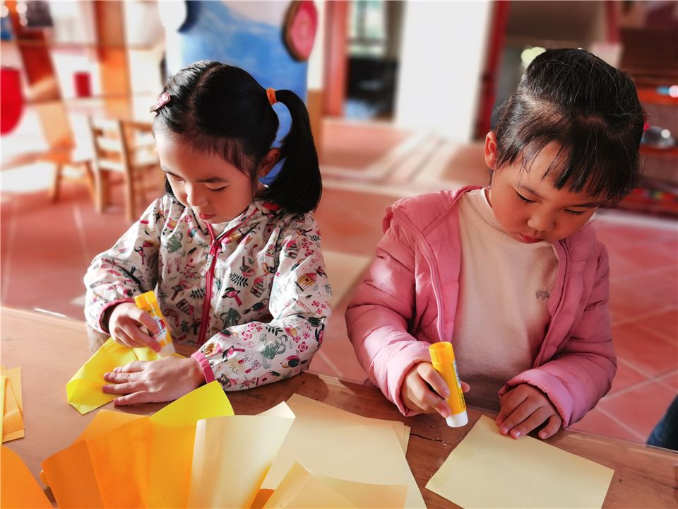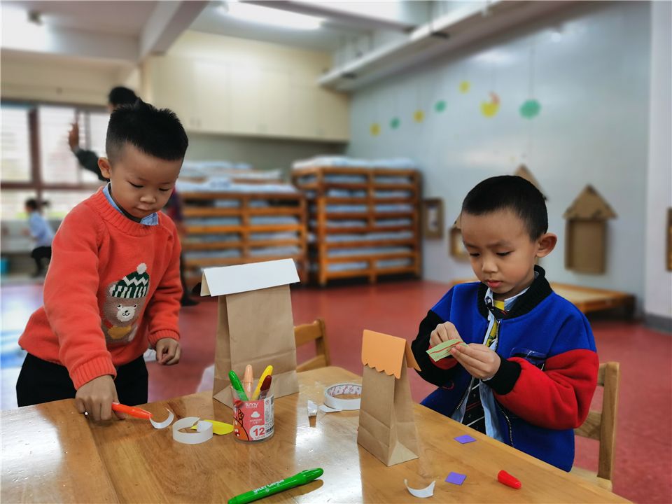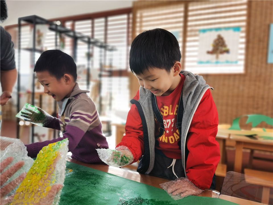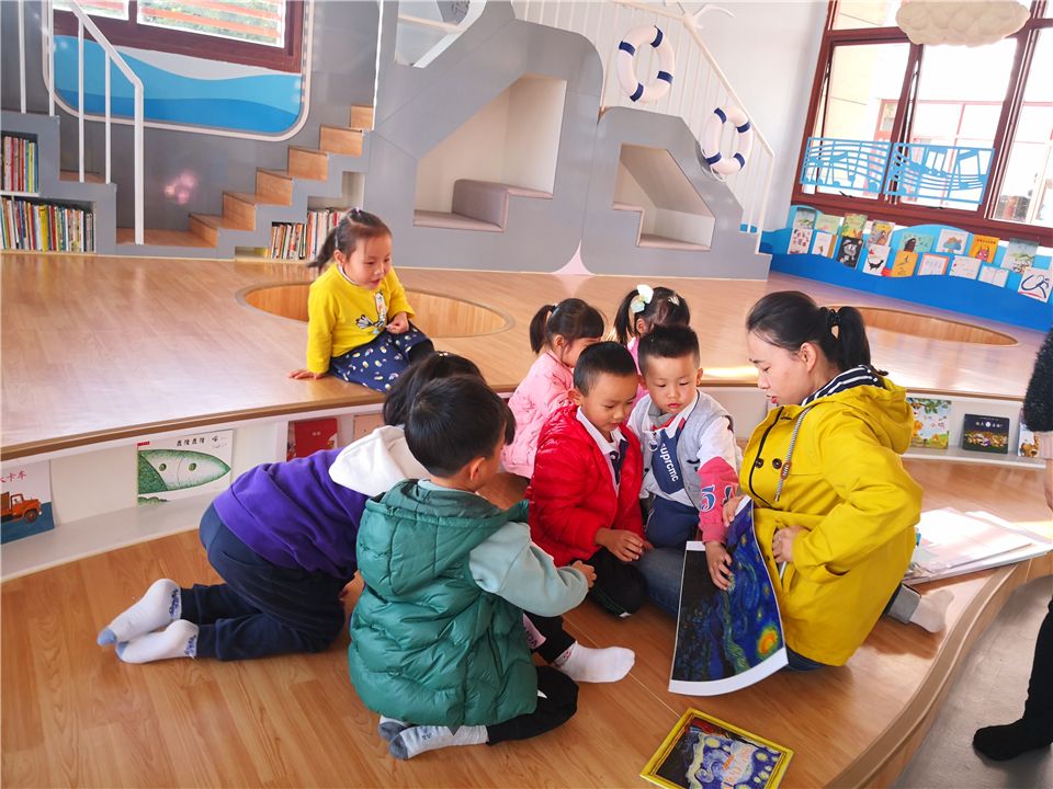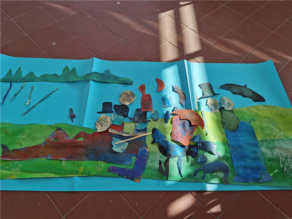 梵高的名作《星空》中有些什么?那闪烁的星河,夜空中闪烁的星星,星空下的房子,都在孩子们的集体画笔涂画、纸袋贴画中产生。
