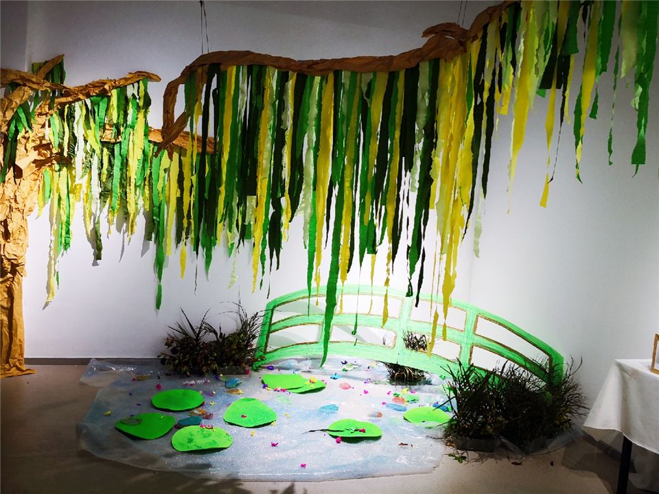 莫奈的《睡莲池塘》,清澈见底的池塘倒映着长长的小桥,美丽的荷花对着我们微微笑,快看!可爱的小青蛙在池塘里跳来跳去呢。