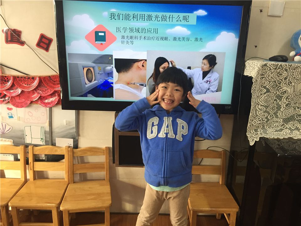 “爸爸再也不用担心他的脊椎啦;妈妈也可以更好地护理皮肤啦;姐姐还可以摘掉多年的近视眼镜啦……谢谢你,激光!让我们的身体更加健康!”