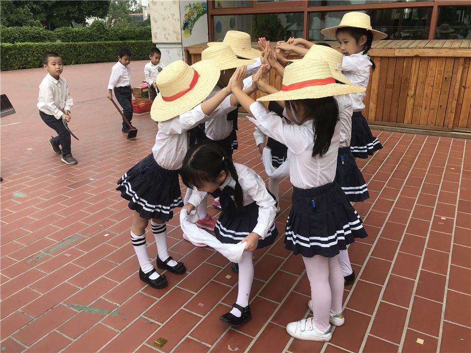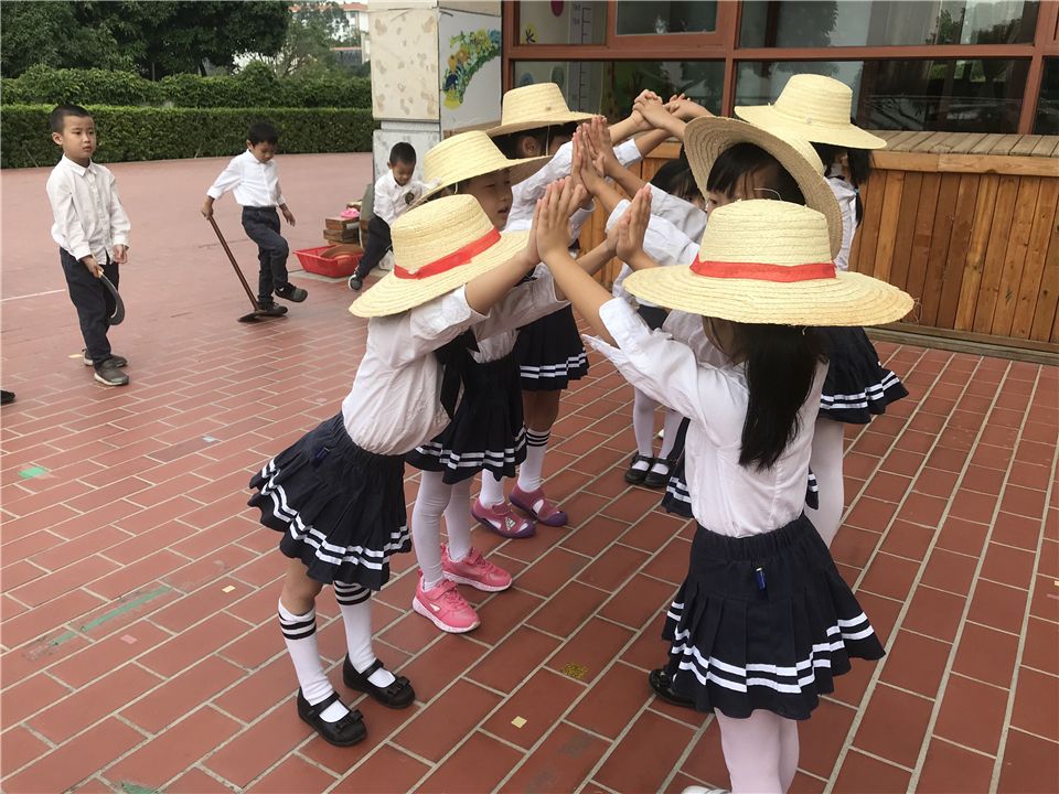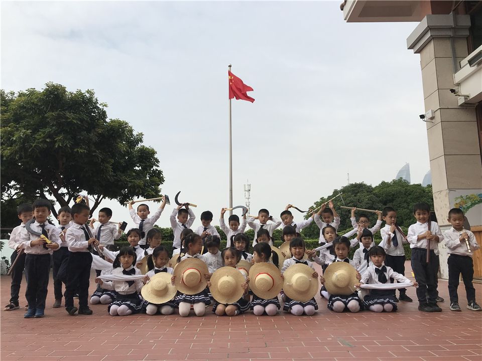 音乐响起,大七班小朋友们纷纷拿着“锄头”“镰刀”“草帽”等道具入场,随着音乐认真舞动,台下小朋友们也看得津津有味。