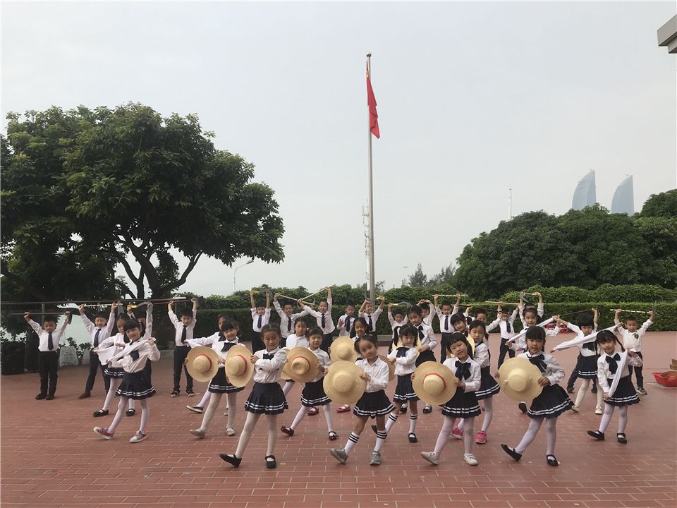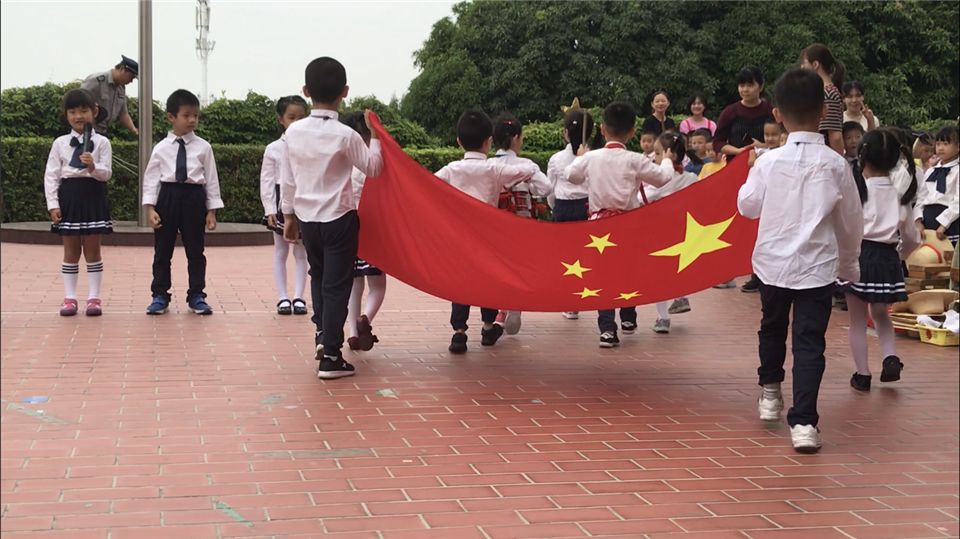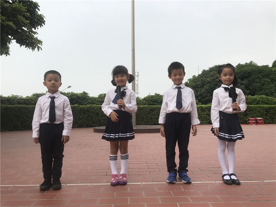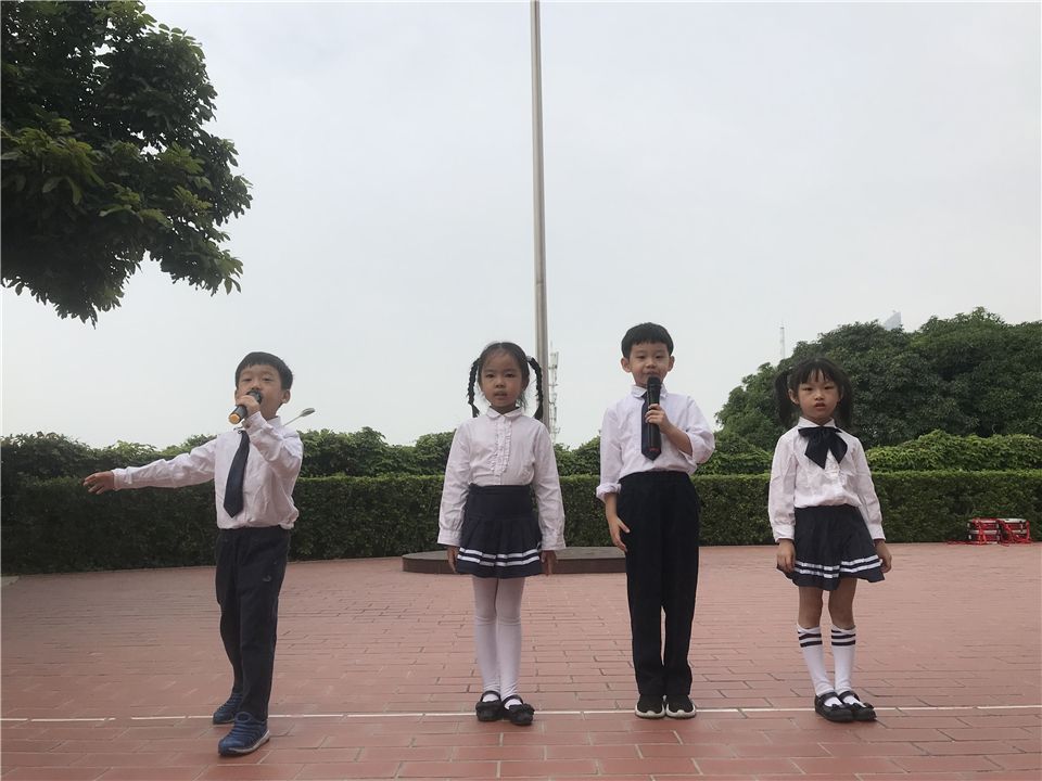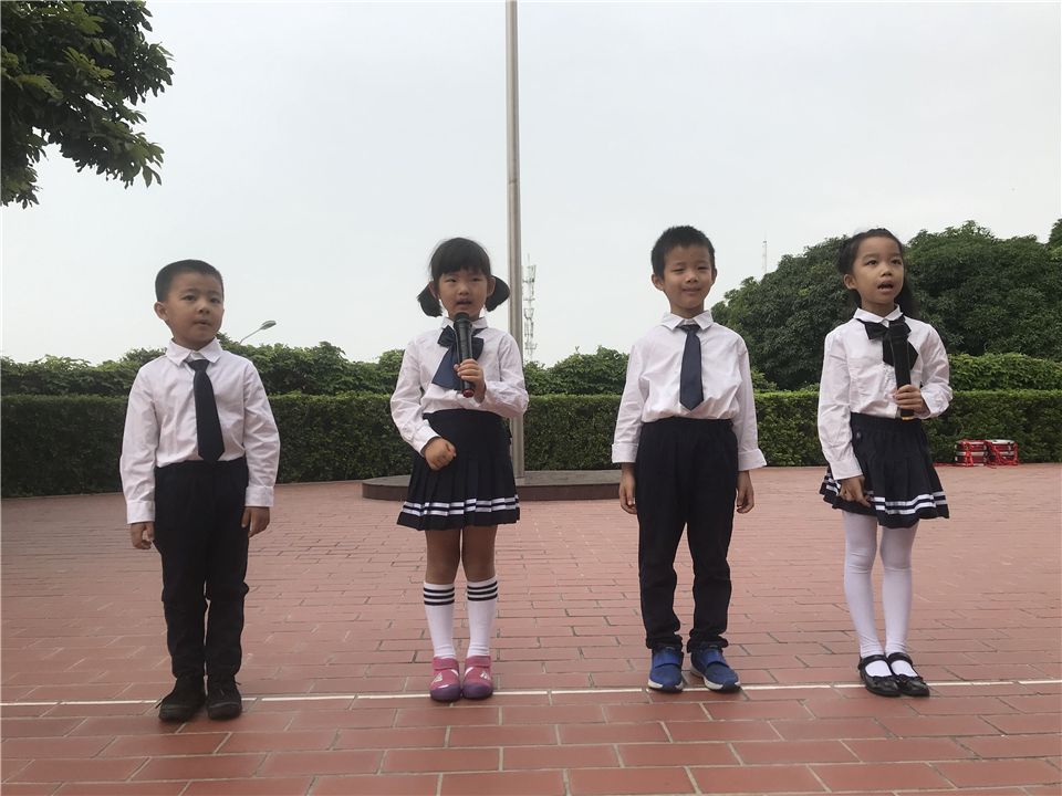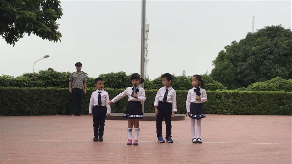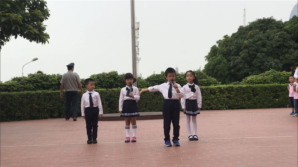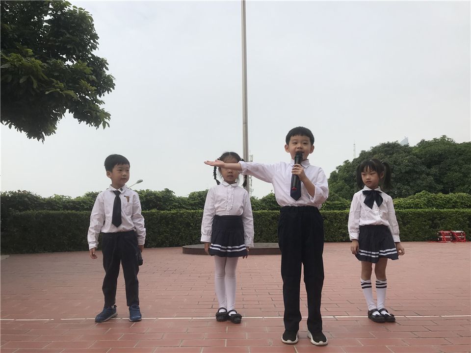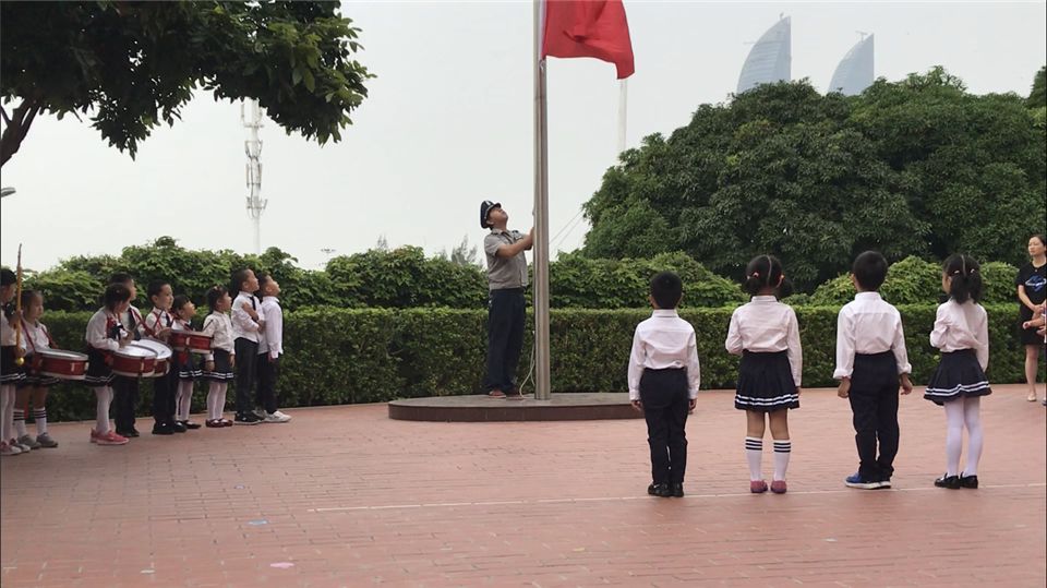 仪仗队的小朋友们步伐整齐划一地把红旗送到保安叔叔的手中,升国旗,奏国歌,全体行注目礼!