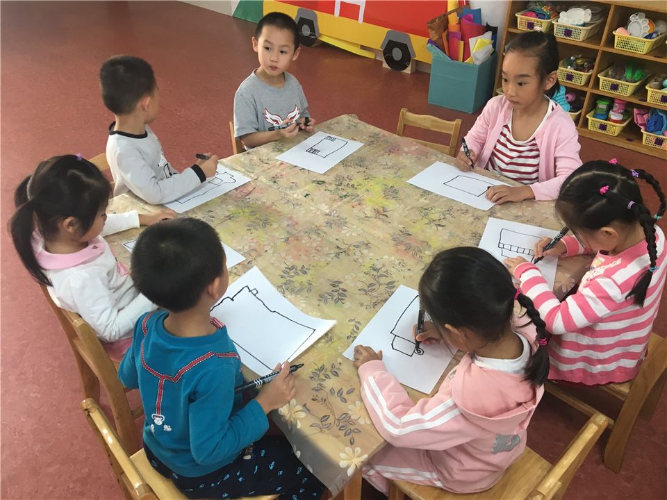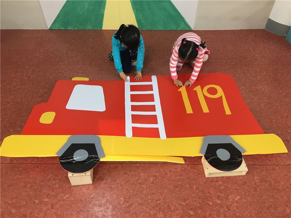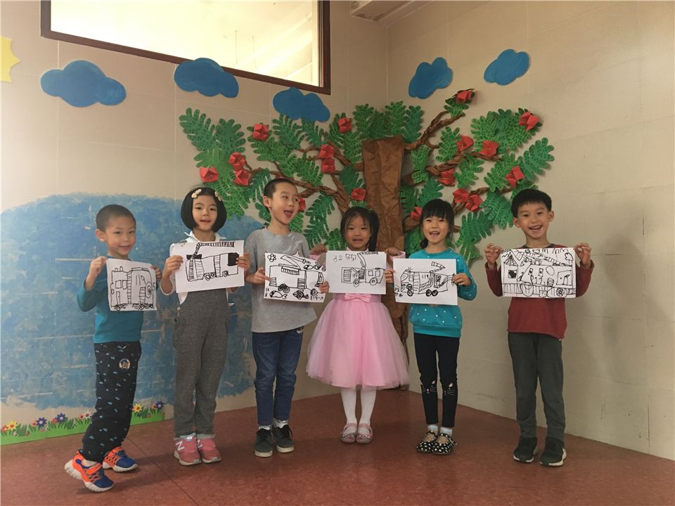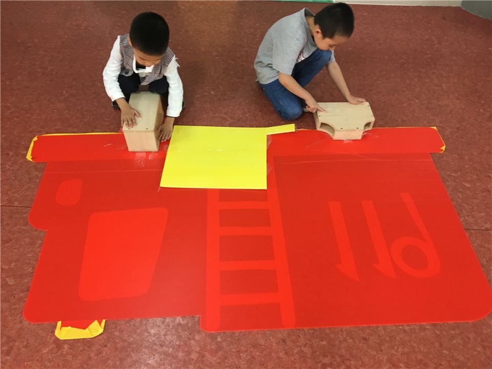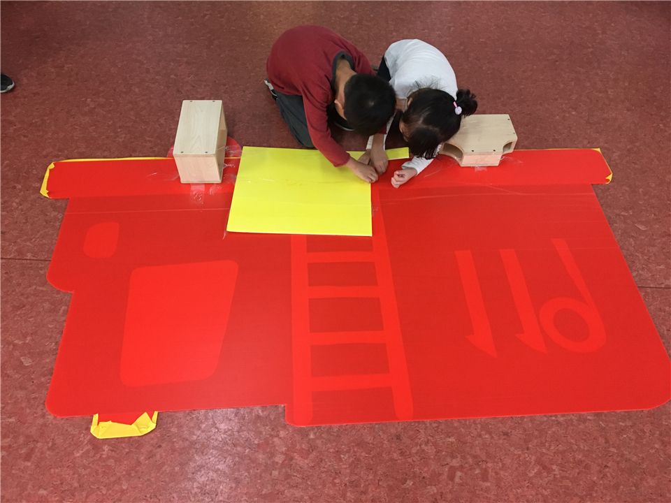我们的小剧场里需要一些表演道具辅助,消防车、小火焰、小房子、消防水管等。先让我们一起来设计一辆消防车吧!陈老师带着我们观察消防车的基本构造,我们专心地听着。