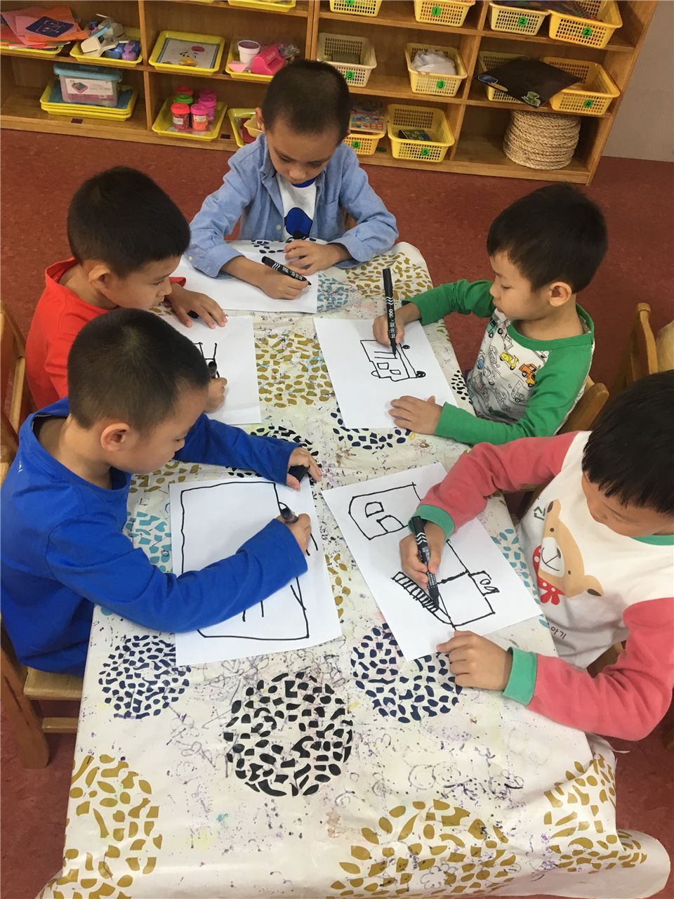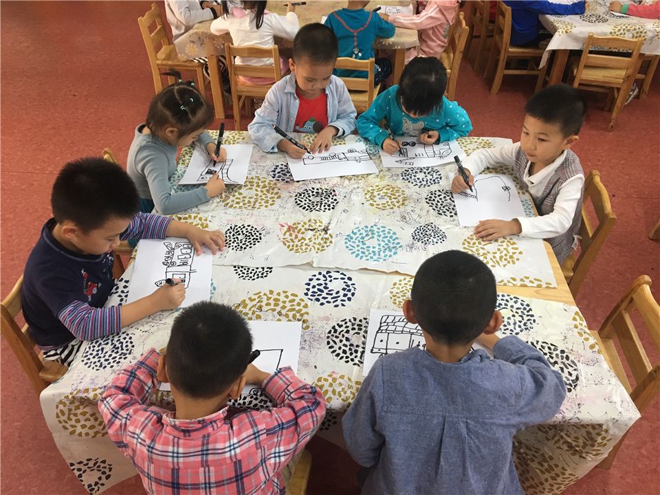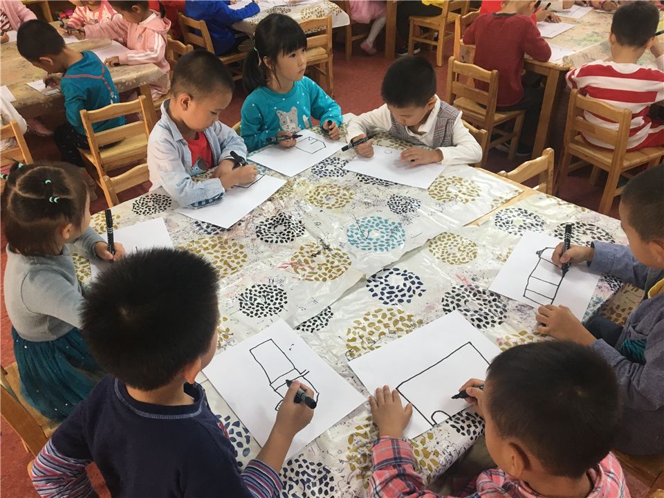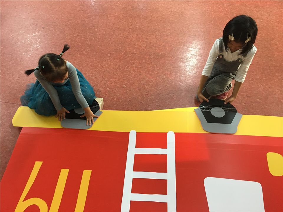 我们的小剧场里需要一些表演道具辅助,消防车、小火焰、小房子、消防水管等。先让我们一起来设计一辆消防车吧!陈老师带着我们观察消防车的基本构造,我们专心地听着。